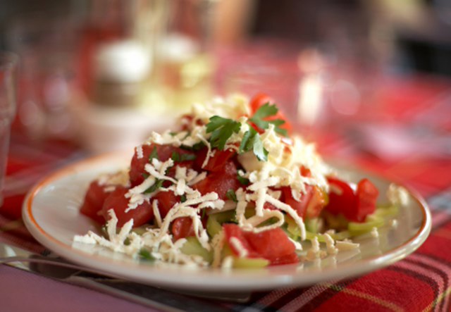 Измијте го зеленчукот. Доматите, олупените краставици и пиперките очистете ги од семките и насецкајте ги на коцки. Сето заедно ставете го во подлабок сад, па додадете ги младиот кромид насецкан на плошки и ситно насецканото луто пиперче. Сето тоа добро измешајте го и оладете. Пред служење салатата посолете ја и забиберете, додадете зејтин и оцет и добро измешајте ја. Одозгора на салатата додадете нарибано бело солено сирење.