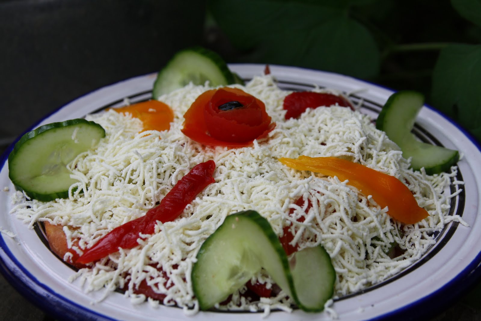 Насецкајте ги свежите домати, свежите краставици и свежите пиперки на коцки и сето тоа добро измешајте го. Потоа додадете ги лутото пиперче исецкано на ситни парчиња и кромидот насецкан на кругови. Салатата зачинете ја со зејтин, оцет и сол. На крајот по салатата нарибајте бело солено сирење. Украсете ја со ливчиња магдонос.