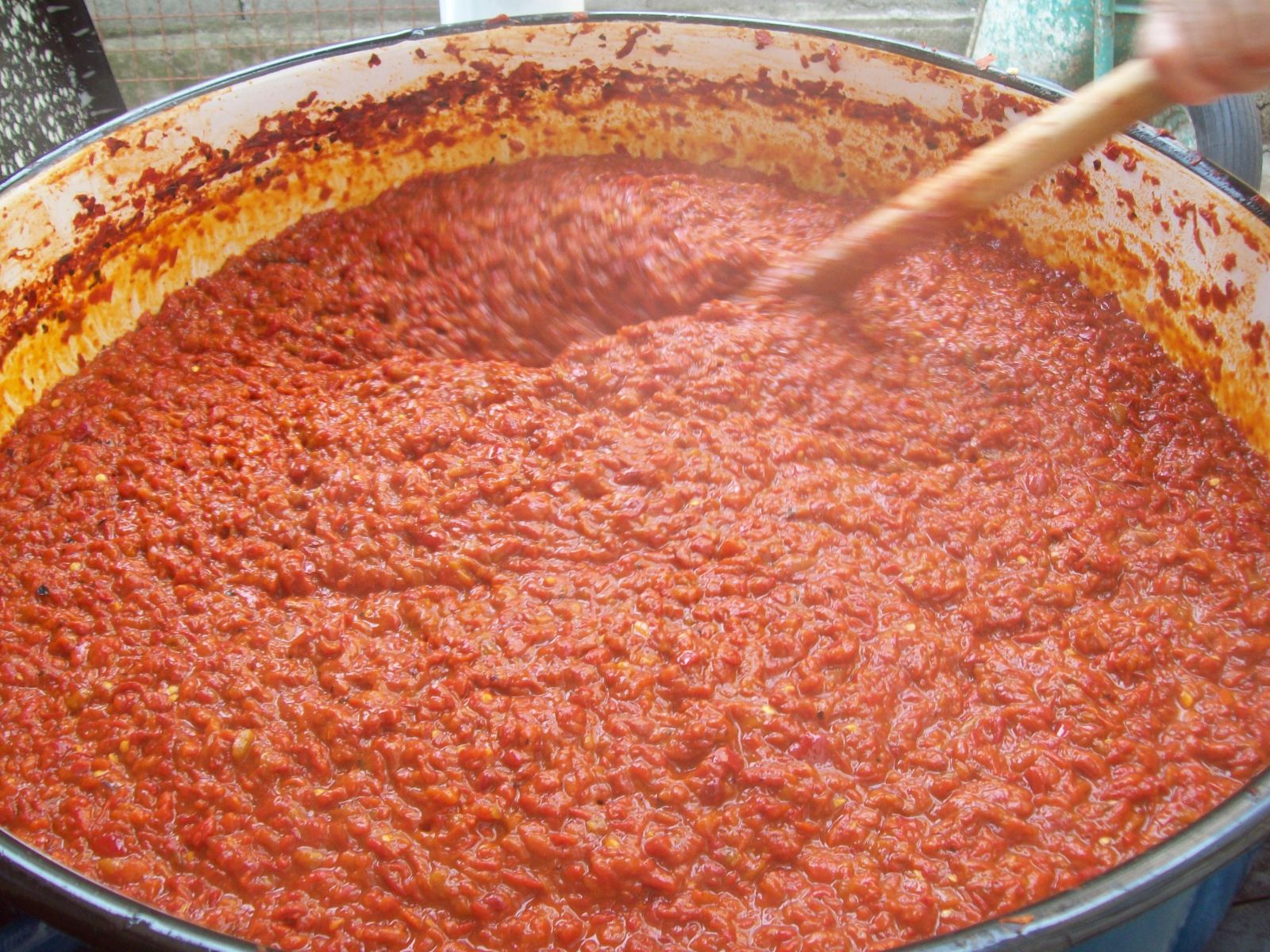 10 кг црвени меснати пиперки, 1 л зејтин, 1/4 л вински оцет, сол