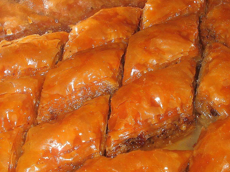 U podmazanom plehu stavljaju se dvije kore i prskaju s otopljenim maslacem. Posipaju se s pistacijama, pokrivaju s dvije kore i ponovo se prskaju s otopljenim maslacem. Postupak se ponavlja dok se sve kore ne iskoriste. Zadnja se kora prska s otopljenim maslacem i baklava se reže na kocke. Peče se na 170 stupnjeva oko 35 min, zatim se temperatura poveća na 210 stupnjeva i peče se još 10 min. Pečena baklava popari se vrućim šerbetom.