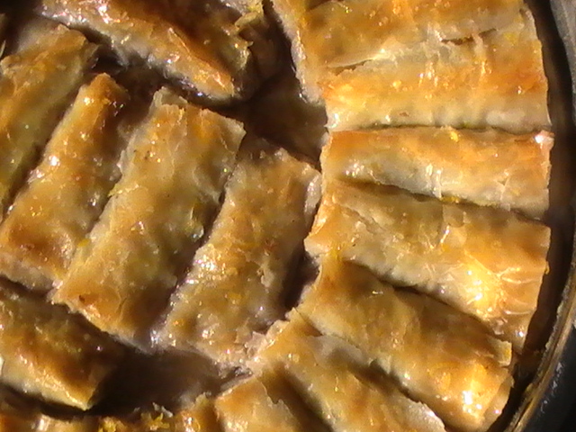 Miješaju se orasi, grožđe i otopljeni margarin. Filuju se kore i to svaka druga. Baklava se reže na kocke i peče u podmazanom plehu dok ne pocrveni. S toplim šerbetom popari se hladna baklava.