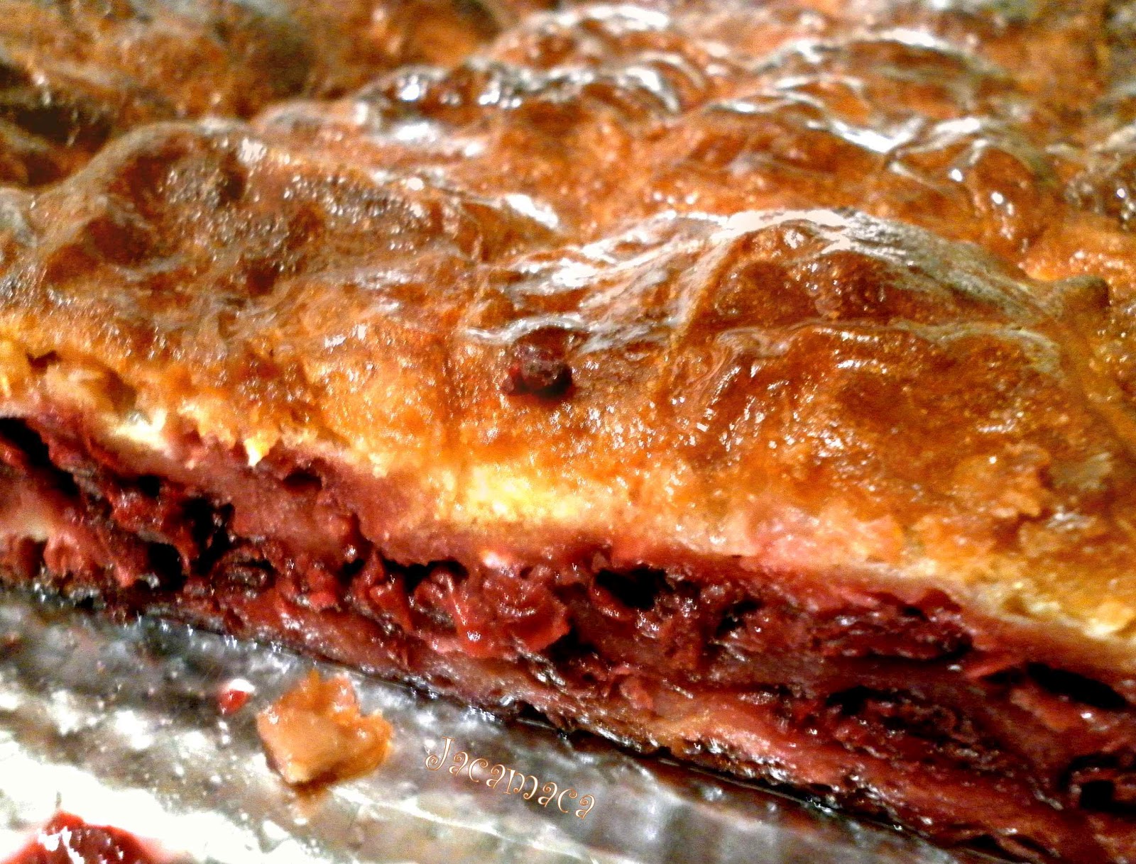 1/2 kg kora za baklavu, 300 gr šećera, 3 jaja, 300 gr ulja, 200 gr kiselog mlijeka, 1 prašak za pecivo, 1 vanilin šećer, 1 kg višanja, 3 žlice pšenične krupice; šerbet: 500 gr šećera, 1,5 čaša vode, kora od 1 limuna i sok od pola limuna