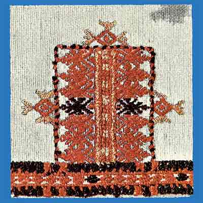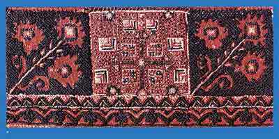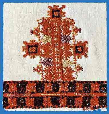 Сл. 7 – Струшко поле, почеток на 20. век. Вез на невестинска шамија за глава, работен со темнцрвена и жолта свила, и црна волна.