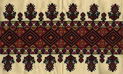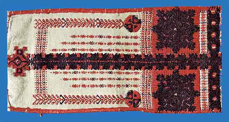 Сл. 5 – Струшко поле, почеток на 20. век. Вез на женска шамија за глава, работен со темноцрвена и црна свила.