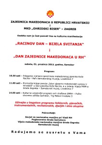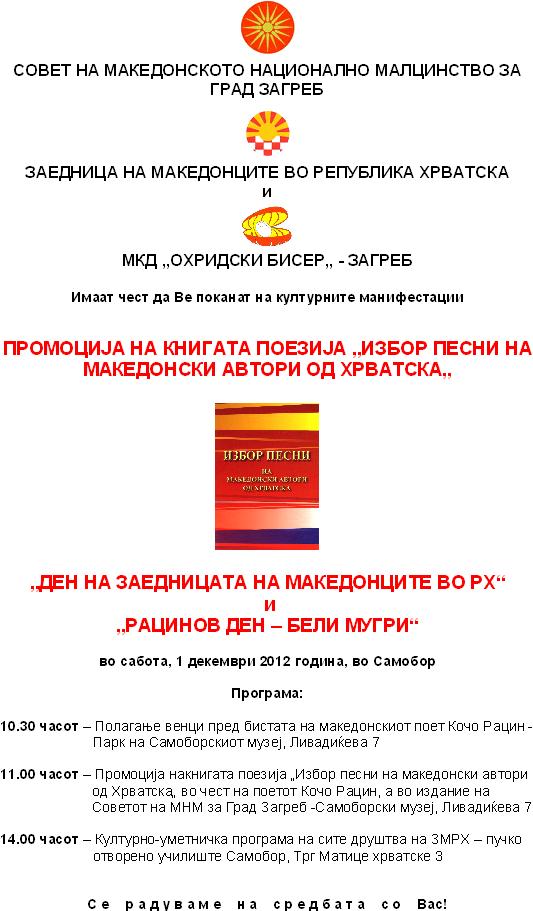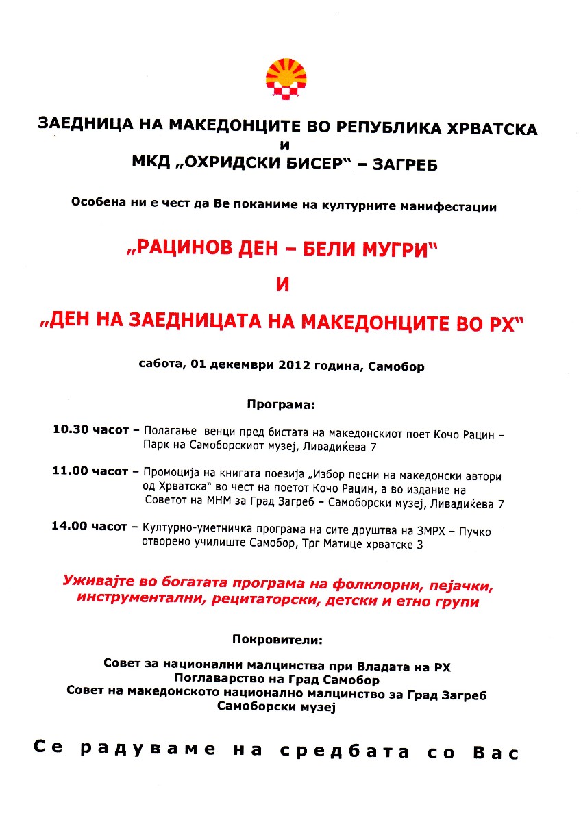 Покана: “Рацинов ден – Бели мугри” и “Ден на Заедницата на Македонците во РХ” во Самобор epetrovska 16. November 2012. ПОКАНА – КОЧО РАЦИН И ДЕН НА ЗМРХ – 2012