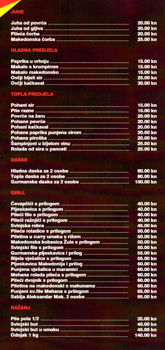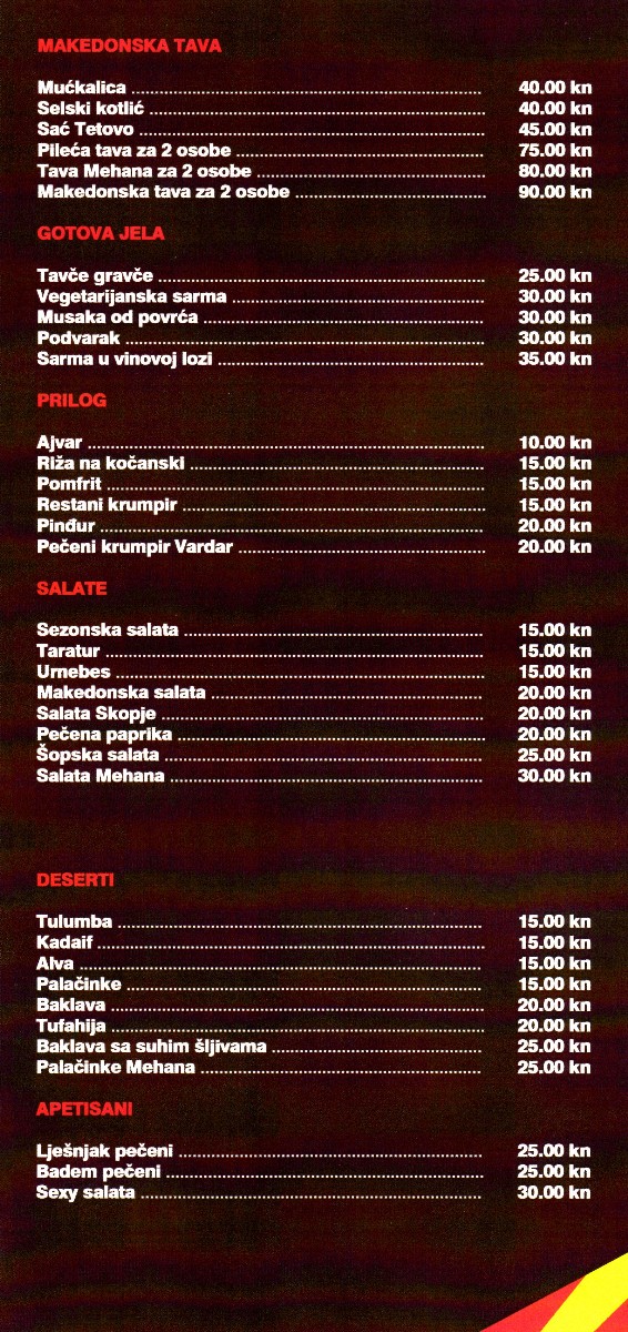 U specifično uređenom ambijentu možete okusiti specijalitete makedonske tradicionalne kuhinje, kao i kvalitetna makedonska vina i sve to obogaćeno zvucima makedonske glazbe
