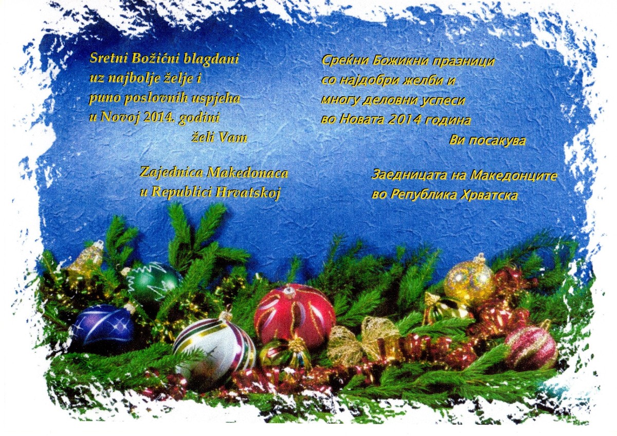Čestitka epetrovska 24. prosinca 2013. BOZIC I NOVA GODINA 2014 * * * Sretan Božić i uspješna Nova 2014. godina Среќен Божиќ и успешна Нова 2014 година Merry Christmas and successful New 2014 year * * * želi Vam * * * Zajednica Makedonaca u Republici Hrvatskoj * * *