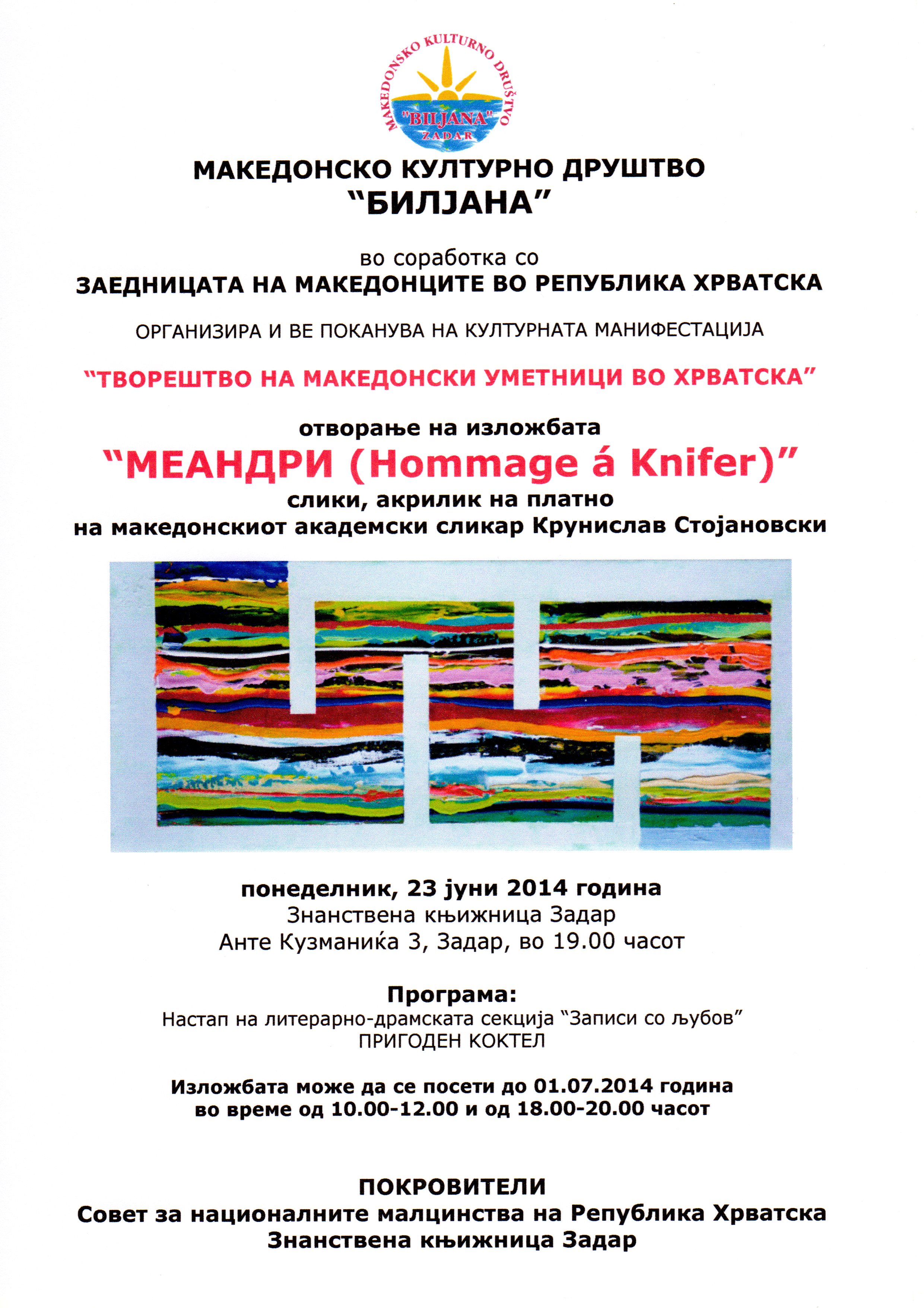 Покана: Изложба “Творештво на македонски уметници во РХ” – Задар epetrovska 11. June 2014. Pozivnica – Stvaralastvo mk. umjetnika u RH