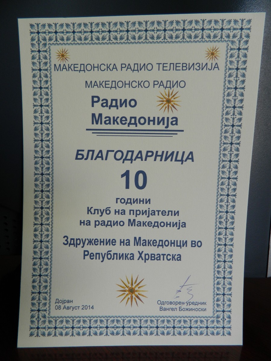 Заедницата на Македонците во Република Хрватска летово се закити со уште една вредна благодарница. Радио Македонија на Македонската радио телевизија на јубилејната „10. Средба на радио пријателите на емисијата „Глас од татковината“ на Радио Македонија“ во Дојран на 8 август 2014 година, додели благодарници на најзаслужните долгогодишни активни соработници и радио пријатели на емисијата „Глас од татковината“. Во просториите на редакцијата на Радио Македонија во Скопје, благодарницата во името на Заедницата на Македонците во Република Хрватска ја прими секретарот Елизабета Петровска, а ѝ ја врачи Даниела Левковска, една од водителките на емисијата „Глас од татковината“.