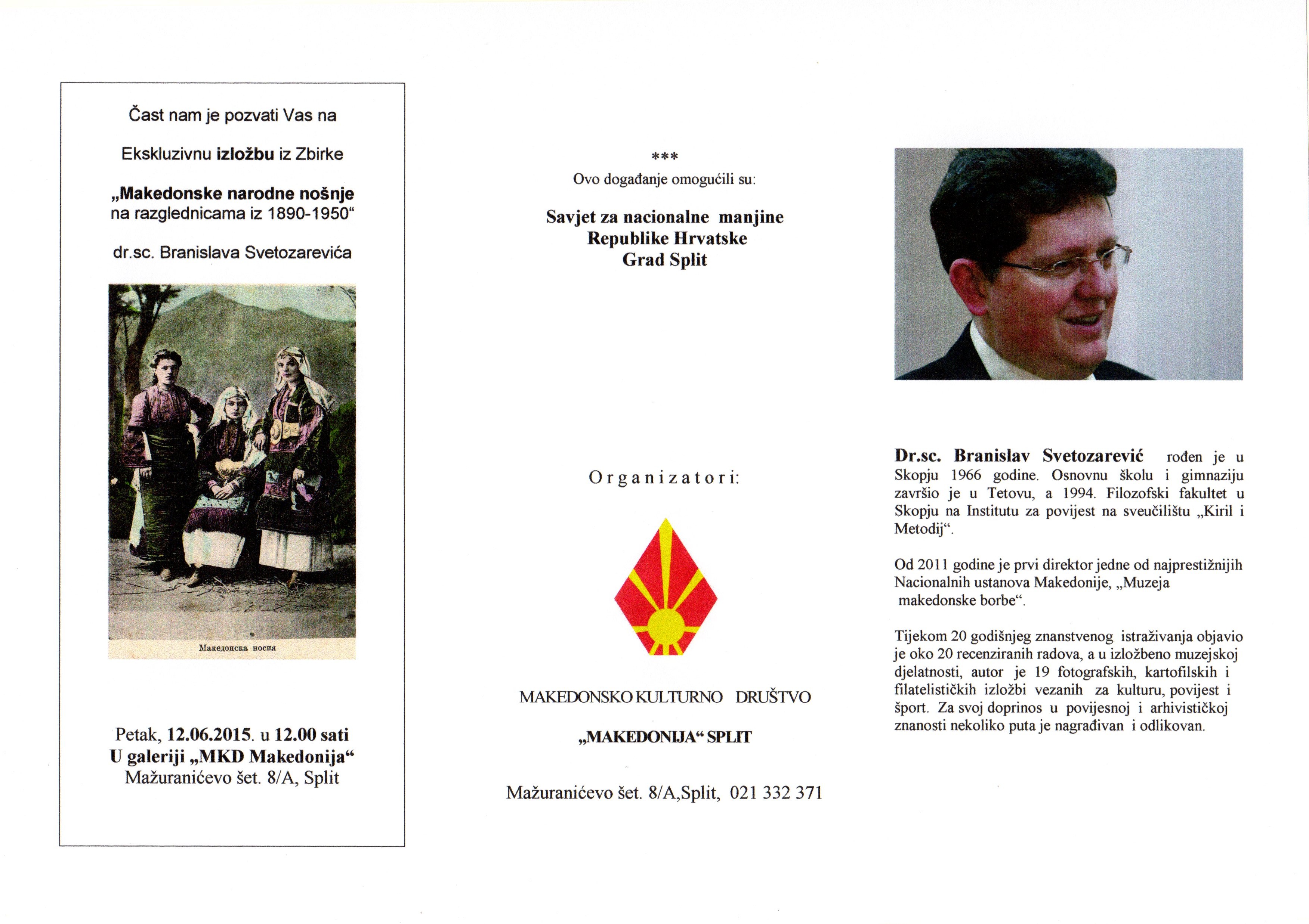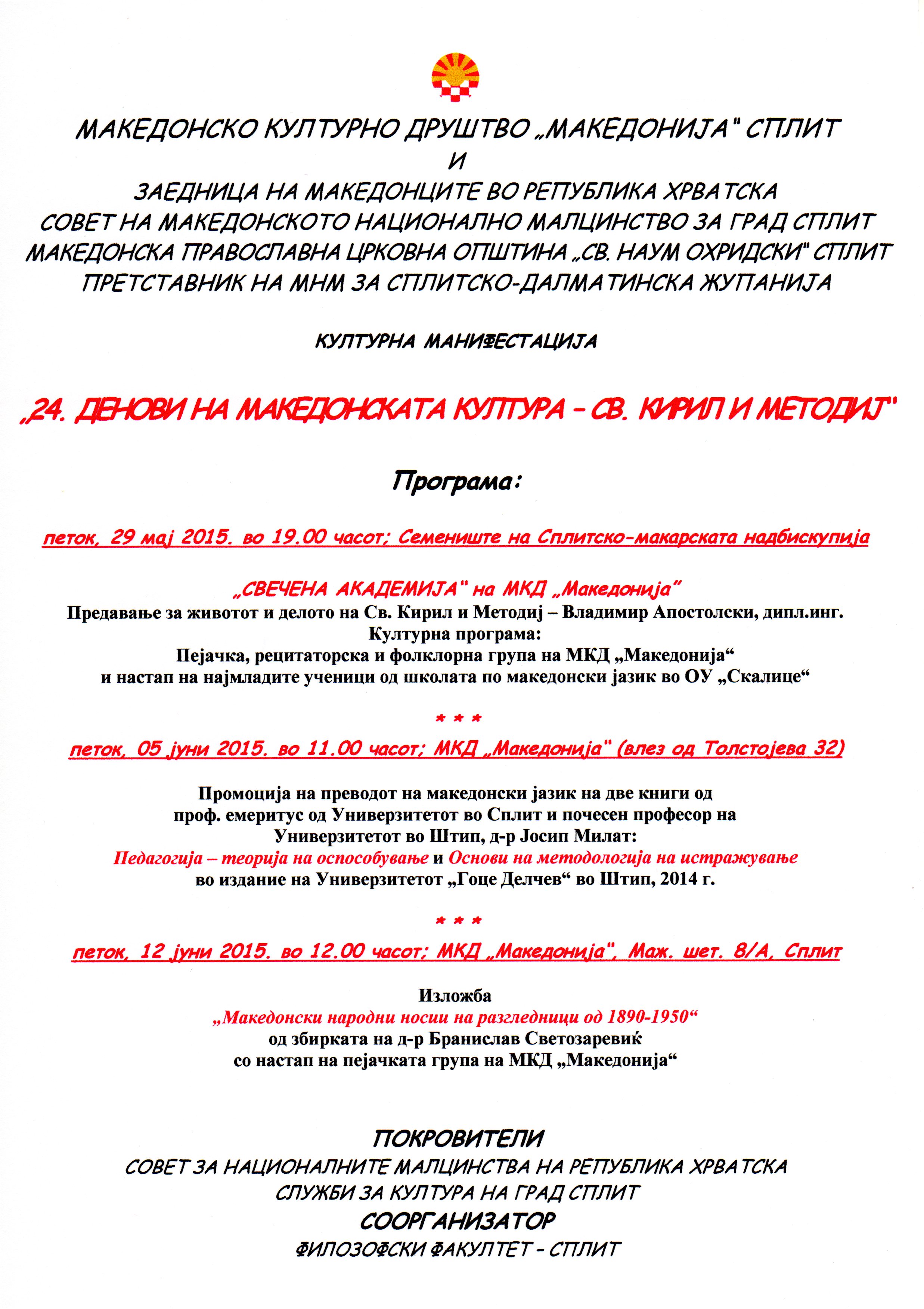 Pozivnica: “24. Dani makedonske kulture – Sv. Kiril i Metodi” – Split epetrovska 28. svibnja 2015. POZIVNICA-24. DANI MK. KULTURE-SPLIT POZIVNICA – PROMOCIJA KNJIGA 5.6.2015 KATALOG IZLOZBE