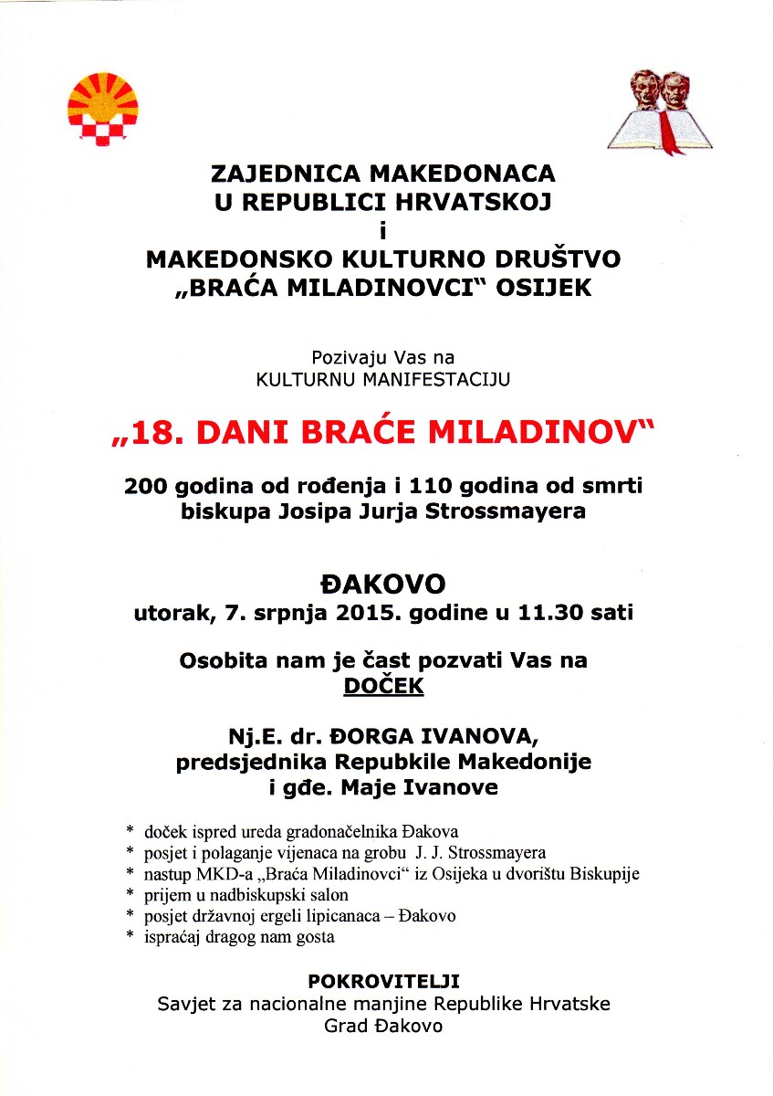 Pozivnica: 18. Dani braće Miladinov u Đakovu epetrovska 6. srpnja 2015. 18. DANI BRACE MILADINOV 2015 3
