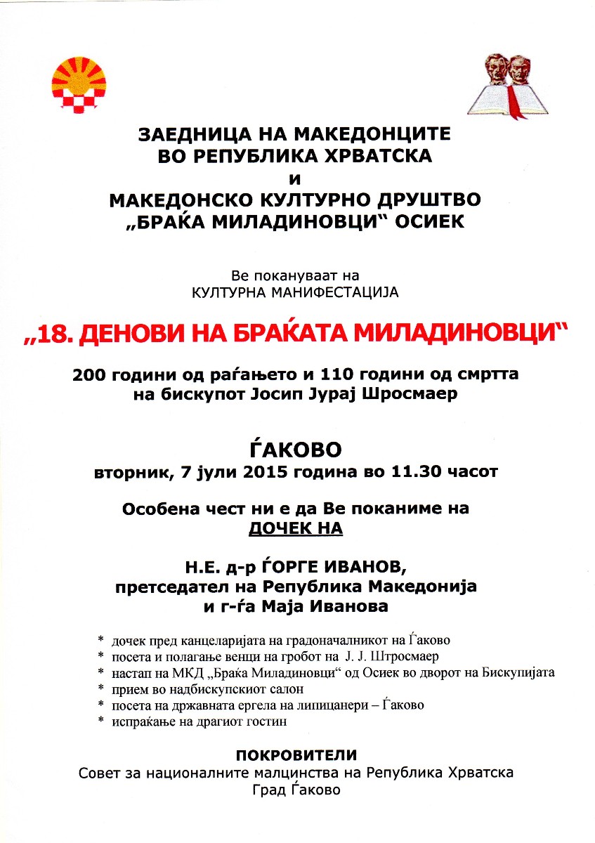 Покана: 18. Денови на браќата Миладиновци во Ѓаково epetrovska 6. July 2015. 18. DANI BRACE MILADINOV 2015 3