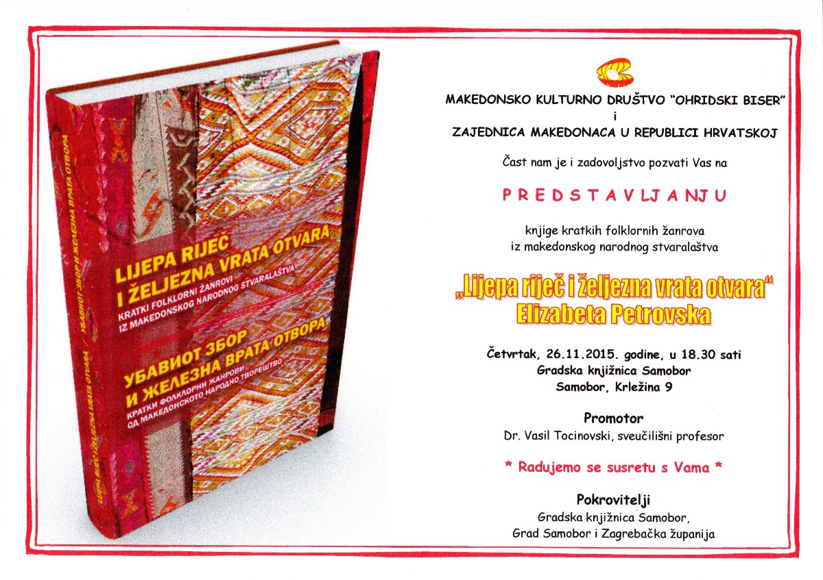 Промоција: Убавиот збор и железна врата отвора – Елизабета Петровска epetrovska 18. November 2015. POZIVNICA ZA PROMOCIJU – LIJEPA RIJEC I ZELJEZNA VRATA OTVARA