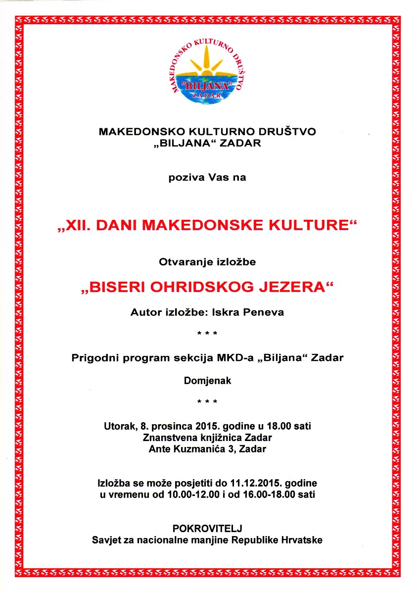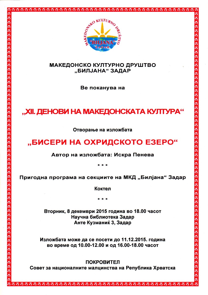 Покана: Денови на македонската култура – Задар epetrovska 3. December 2015. ZADAR – POZIVNICA DANI MK KULTURE 2015 IZLOZBA
