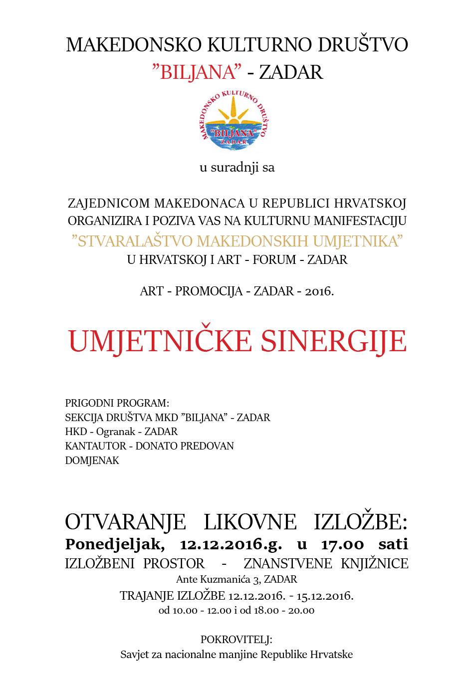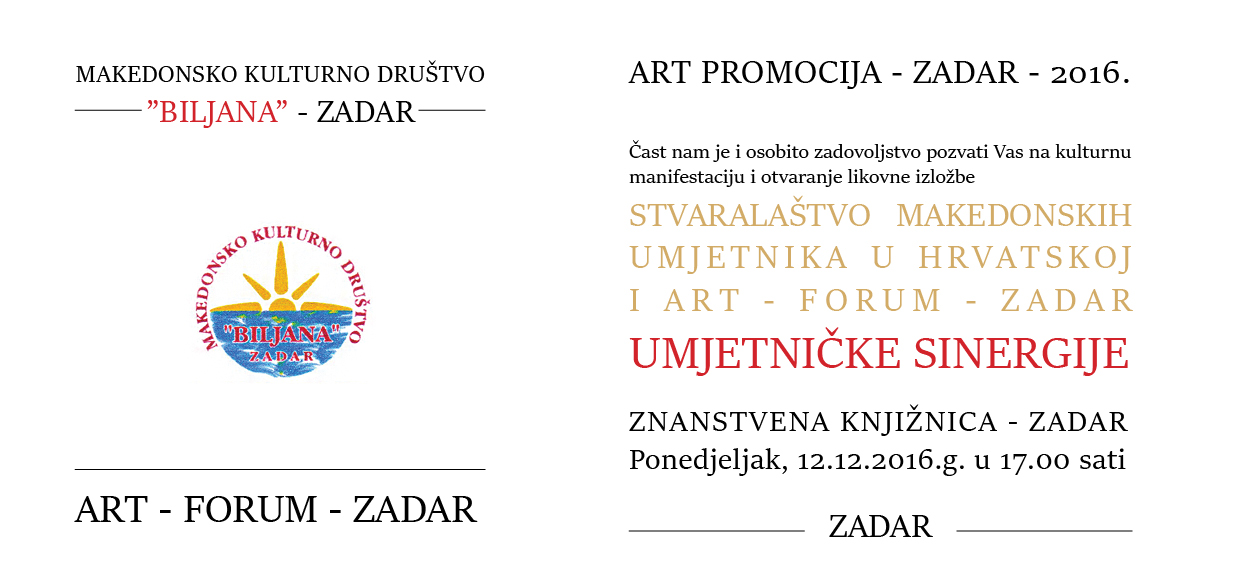 Покана: Изложба “Творештво на македонски уметници во РХ” – Задар epetrovska 7. December 2016. Pozivnica – Stvaralastvo mk. umjetnika u RH – katalog