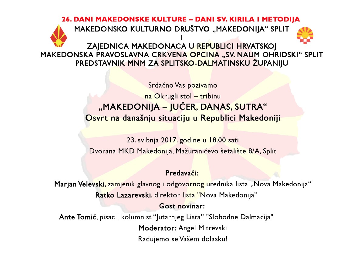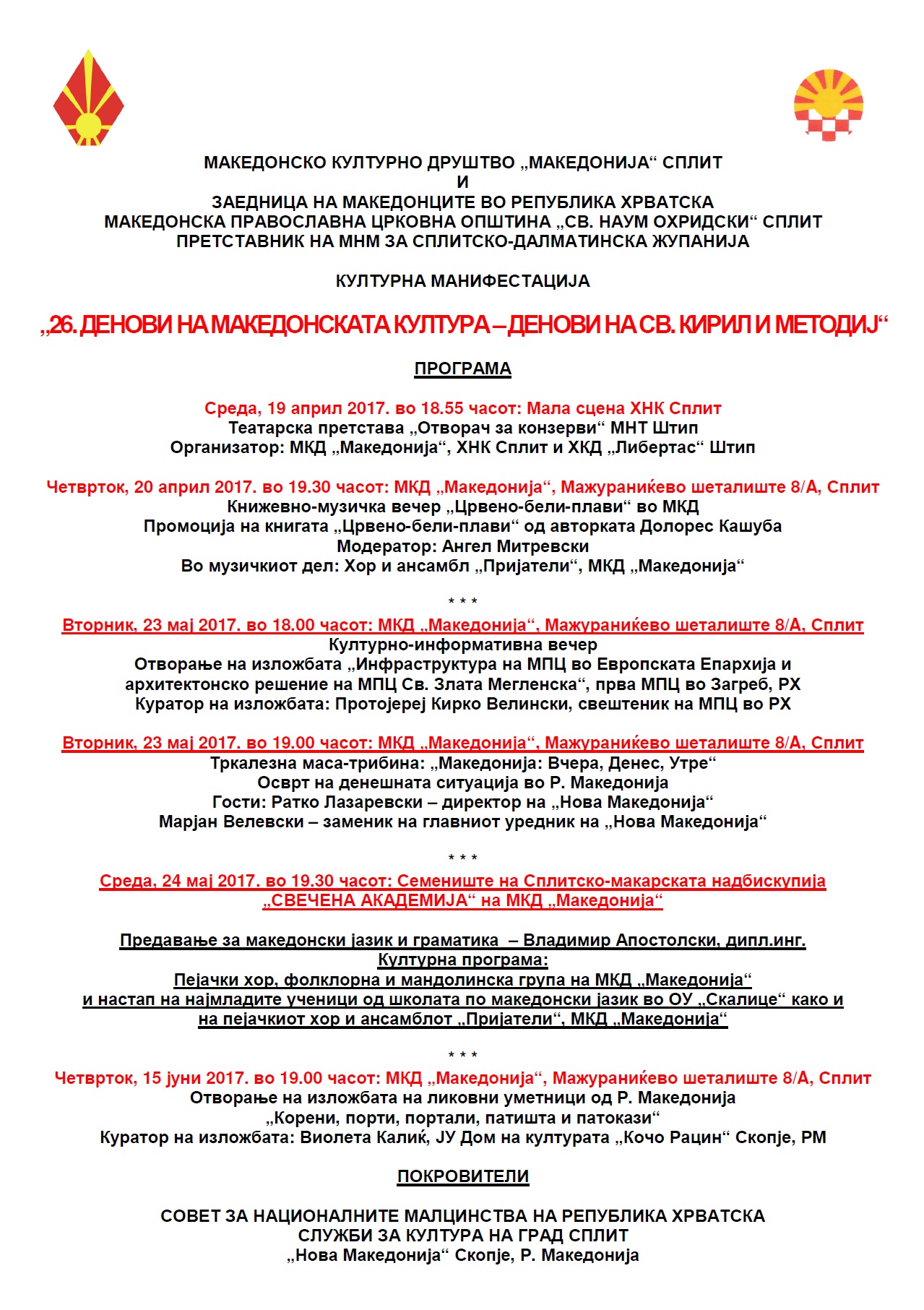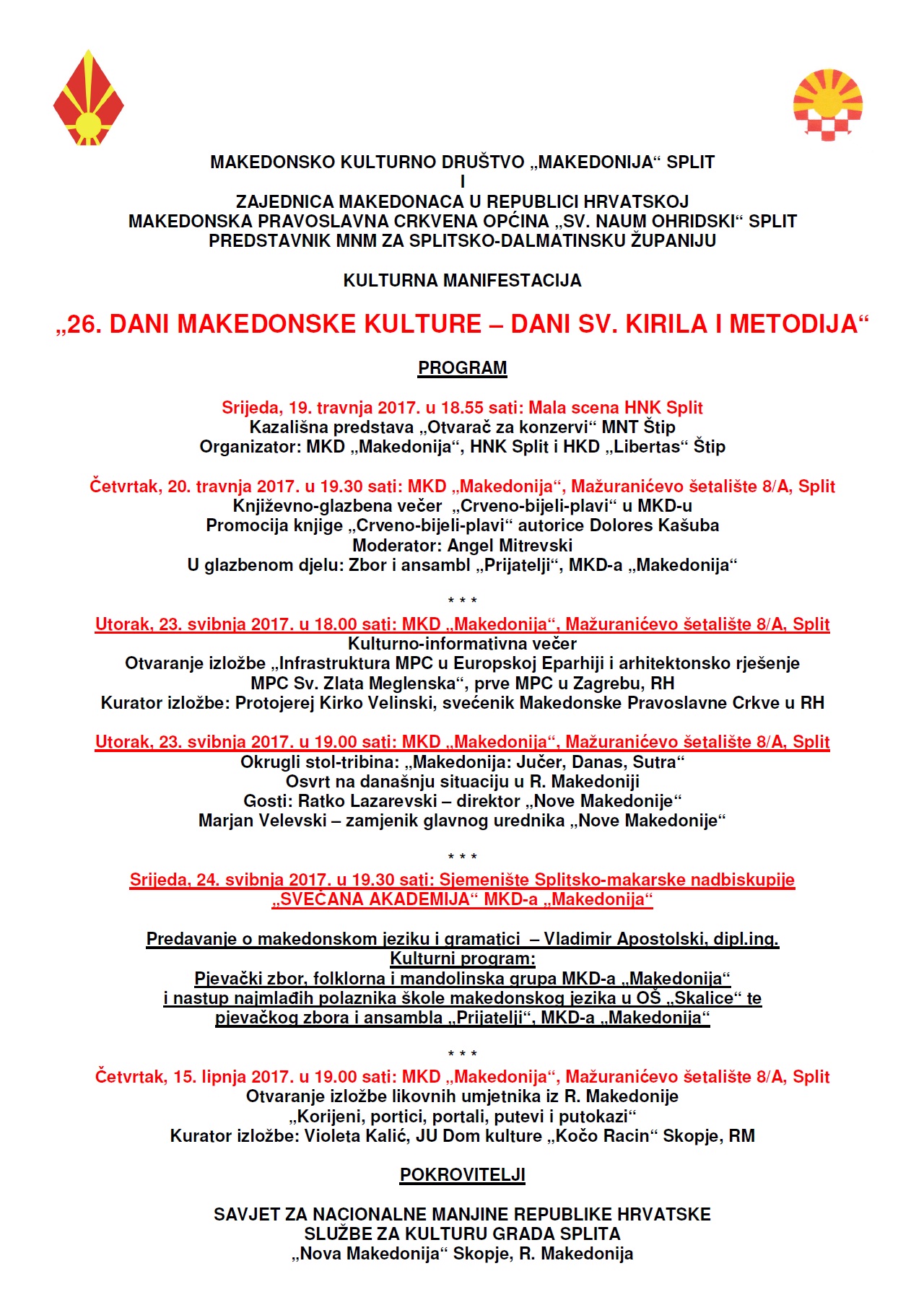 Покана: “26. Денови на македонската култура – Денови на Св. Кирил и Методиј” – Сплит epetrovska 17. May 2017. POZIVNICA-26. DANI MK. KULTURE-SPLIT Katalog MPCO