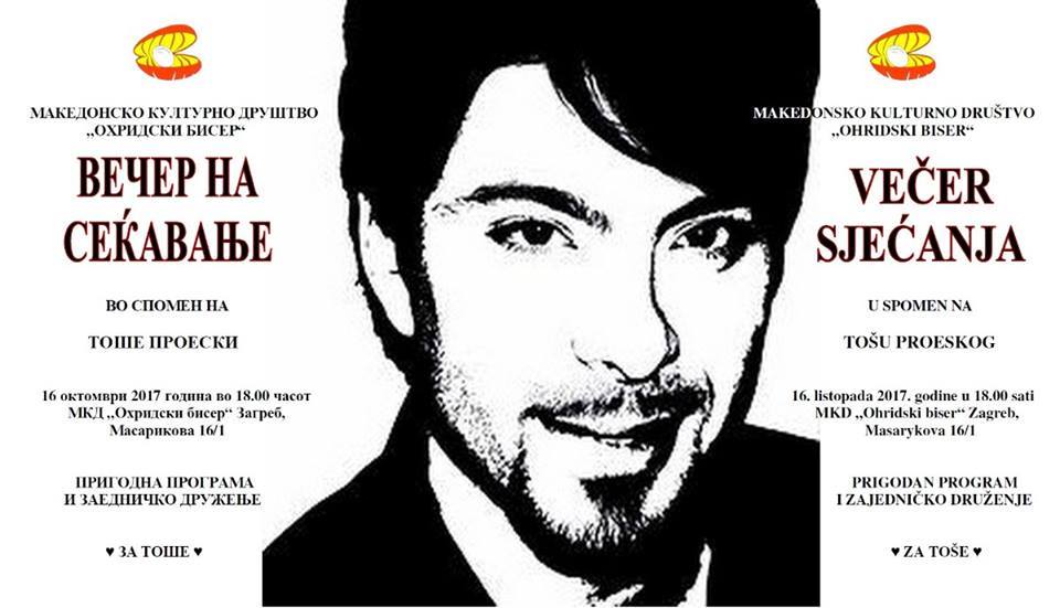 Ин мемориам – Тоше Проески epetrovska 16. October 2017. “Кога ќе ви одземат сè, ќе ви останат двете раце, составете ги една до друга за молитва… Tогаш ќе бидете НАЈСИЛНИ.” Тодор (Тоше) Проески 16.10.2007. – 16.10.2017. TOSE PROESKI – VECER SJECANJA