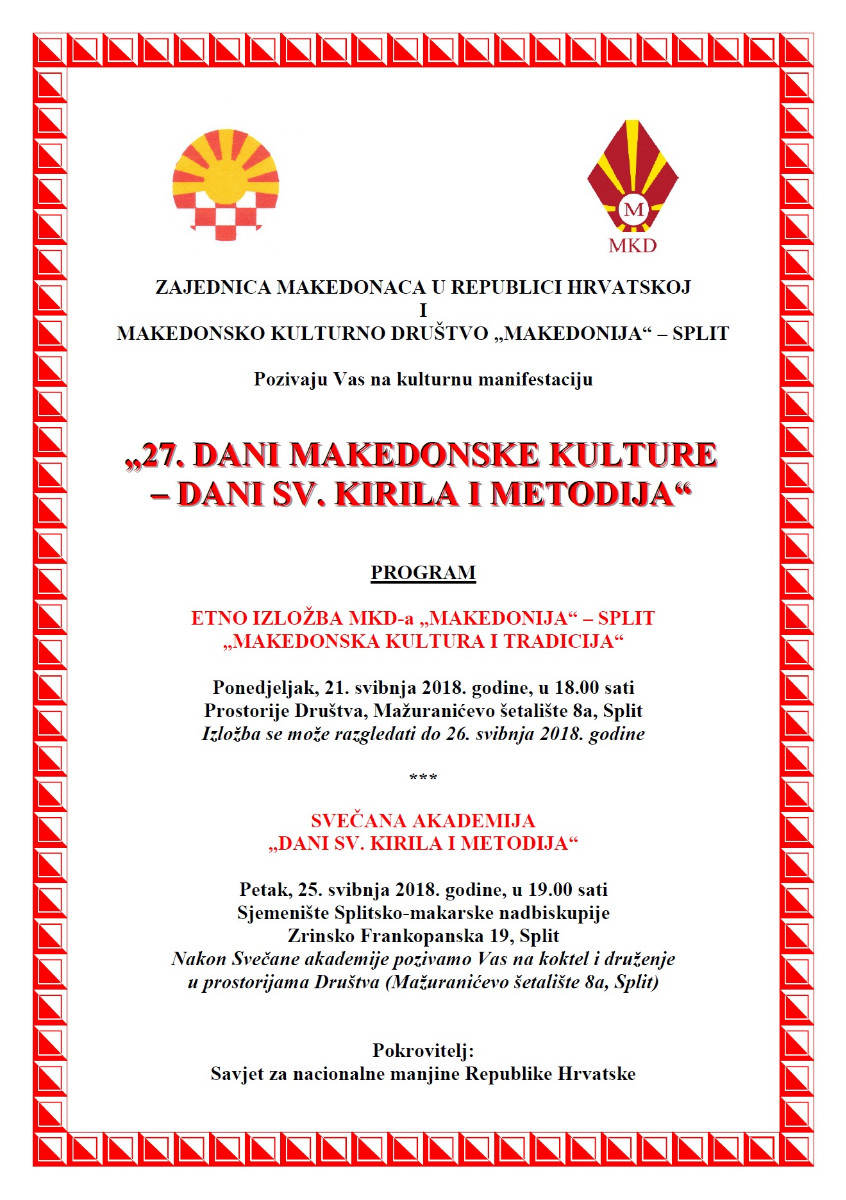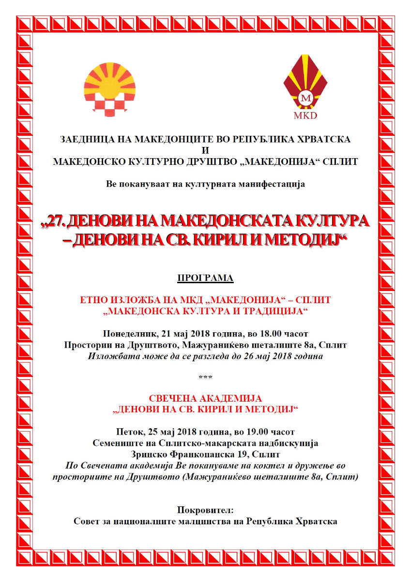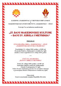 Покана: “27. Денови на македонската култура – Денови на Св. Кирил и Методиј” – Сплит epetrovska 17. May 2018. POZIVNICA-27. DANI MK. KULTURE-SPLIT