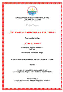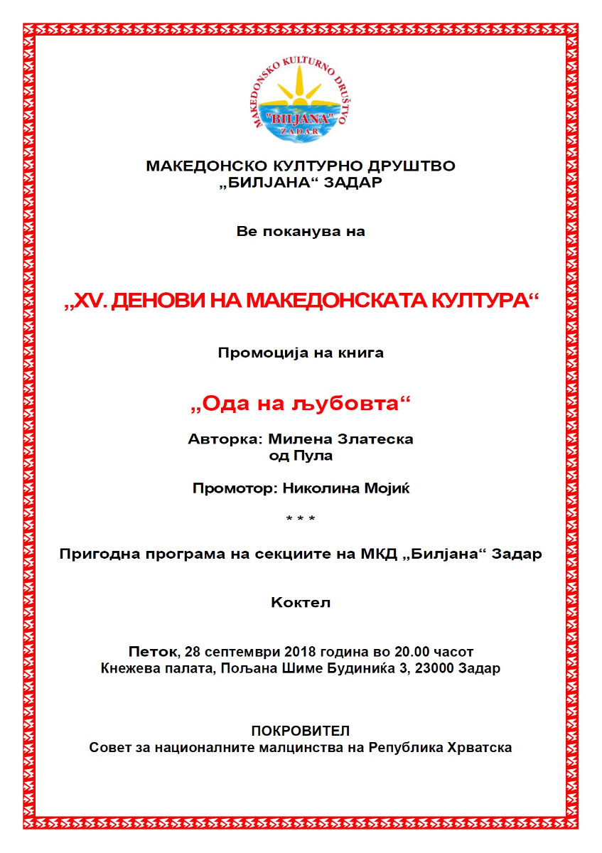 Pozivnica: Dani makedonske kulture u Zadru epetrovska 21. rujna 2018. ZADAR – POZIVNICA DANI MK KULTURE 2018 PROMOCIJA 1