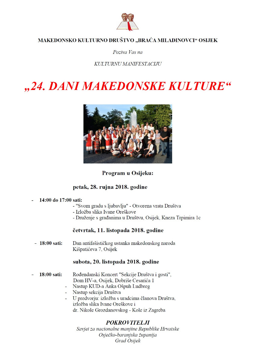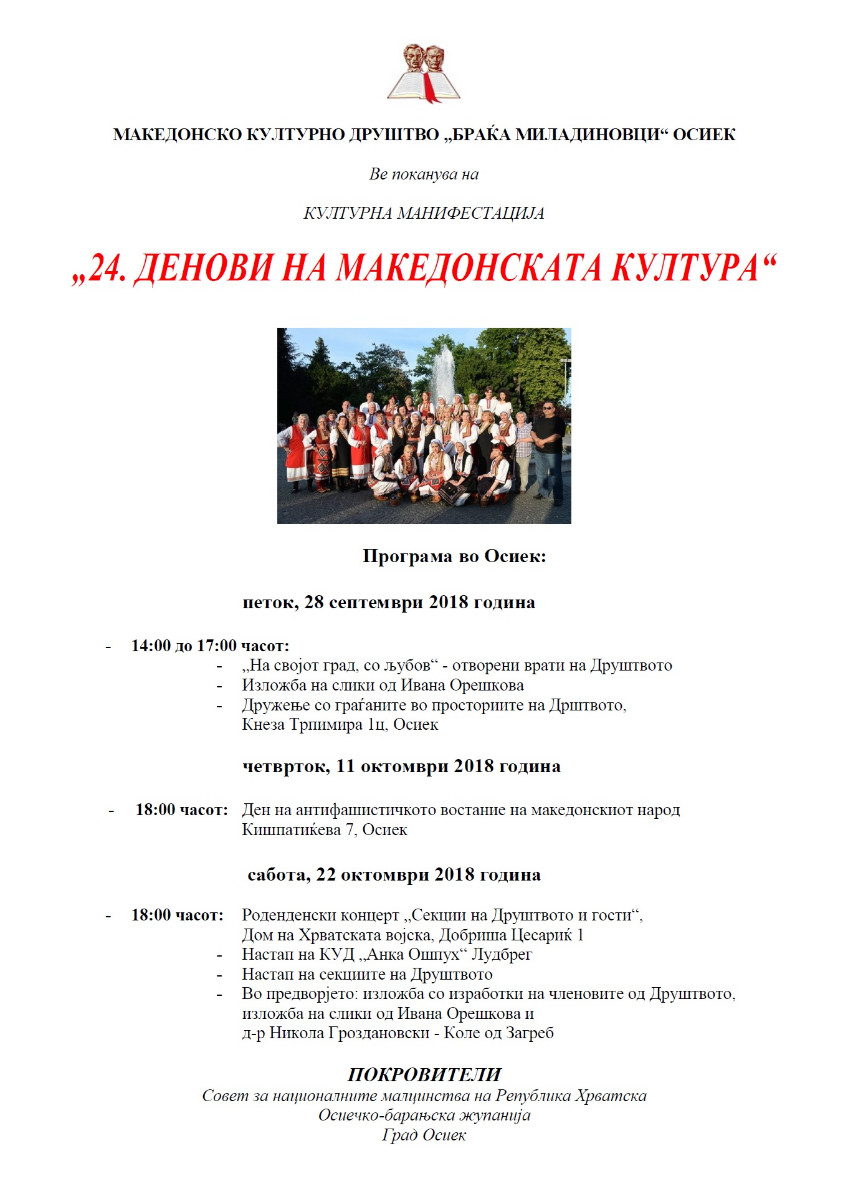 Покана: 24. Денови на македонската култура во Осиек epetrovska 12. October 2018. 24. DANI MAK KULTURE OSIJEK-POZIVNICA 2018