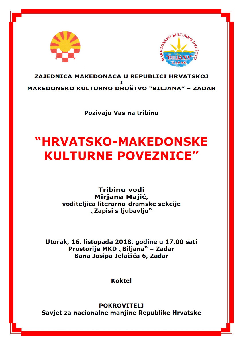 Покана: Трибина “Хрватско-македонски културни врски” во Задар epetrovska 12. October 2018. POZIVNICA TRIBINA 2018 – ZADAR