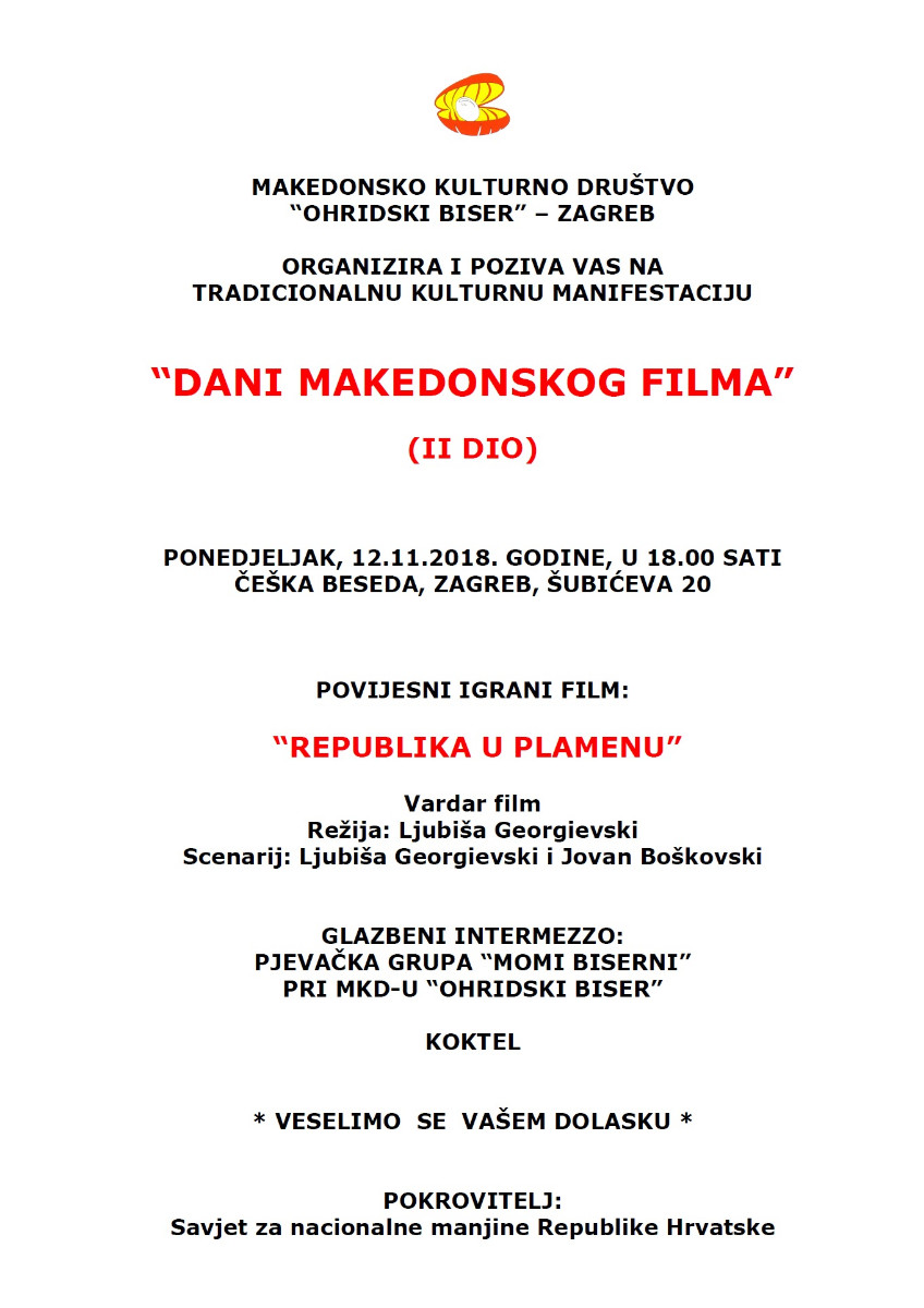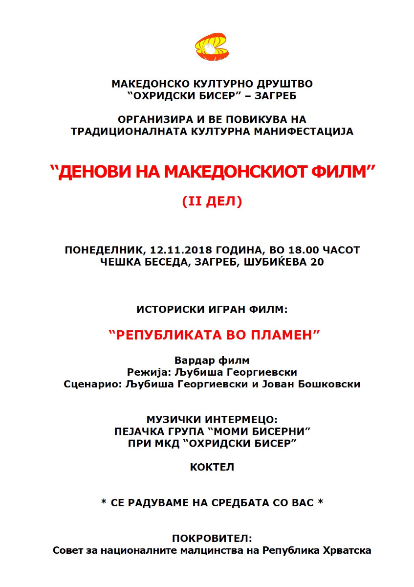 Покана: “Денови на македонскиот филм” во Загреб epetrovska 5. November 2018. POZIVNICA ZA DANI MAKEDONSKOG FILMA 2018