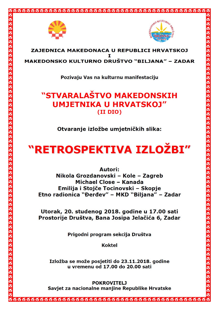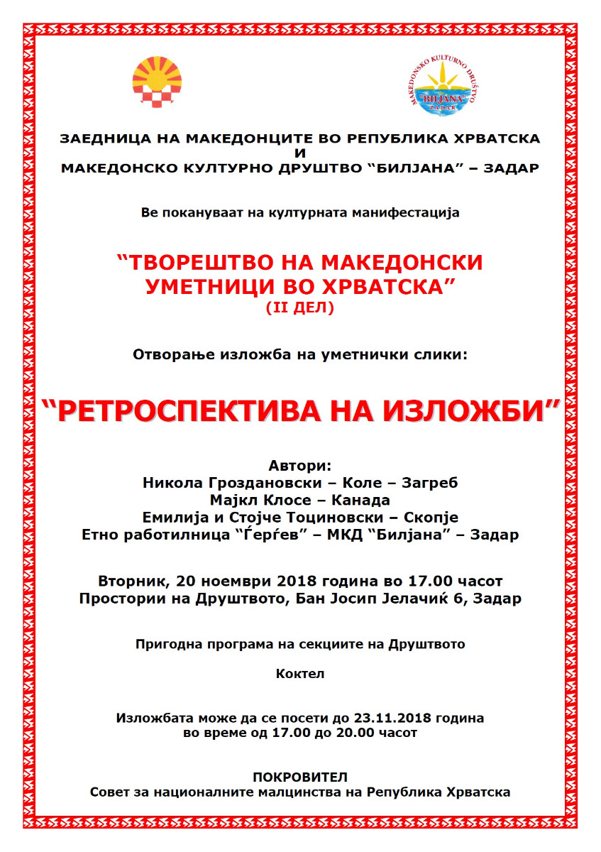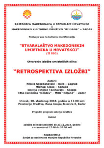 Покана: Изложба “Творештво на македонски уметници во РХ” II дел – Задар epetrovska 12. November 2018. Pozivnica – Stvaralastvo mk. umjetnika u RH – II dio