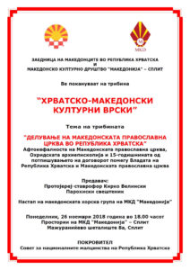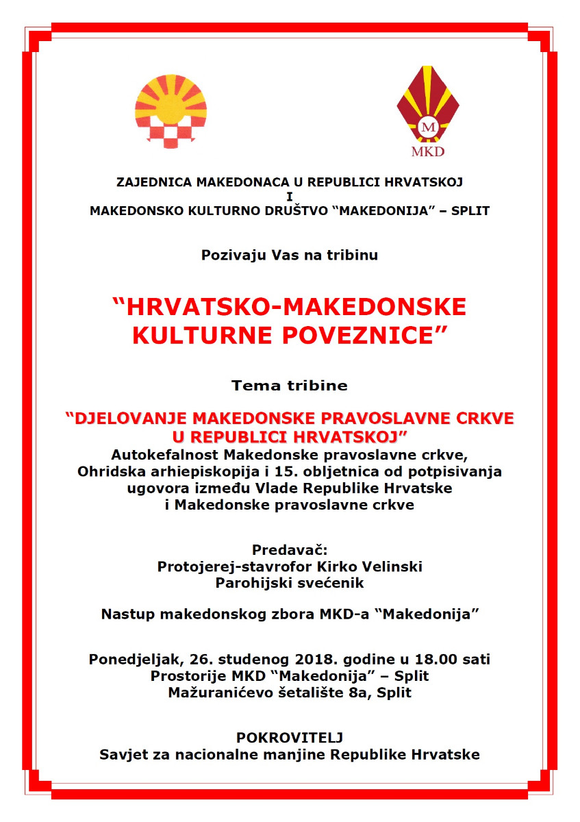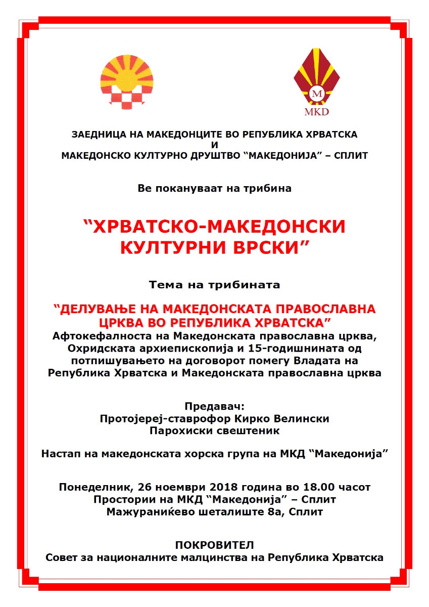 Покана: Трибина “Хрватско-македонски културни врски” во Сплит epetrovska 20. November 2018. POZIVNICA TRIBINA 2018 – SPLIT