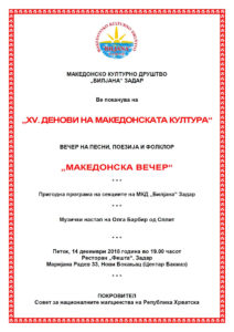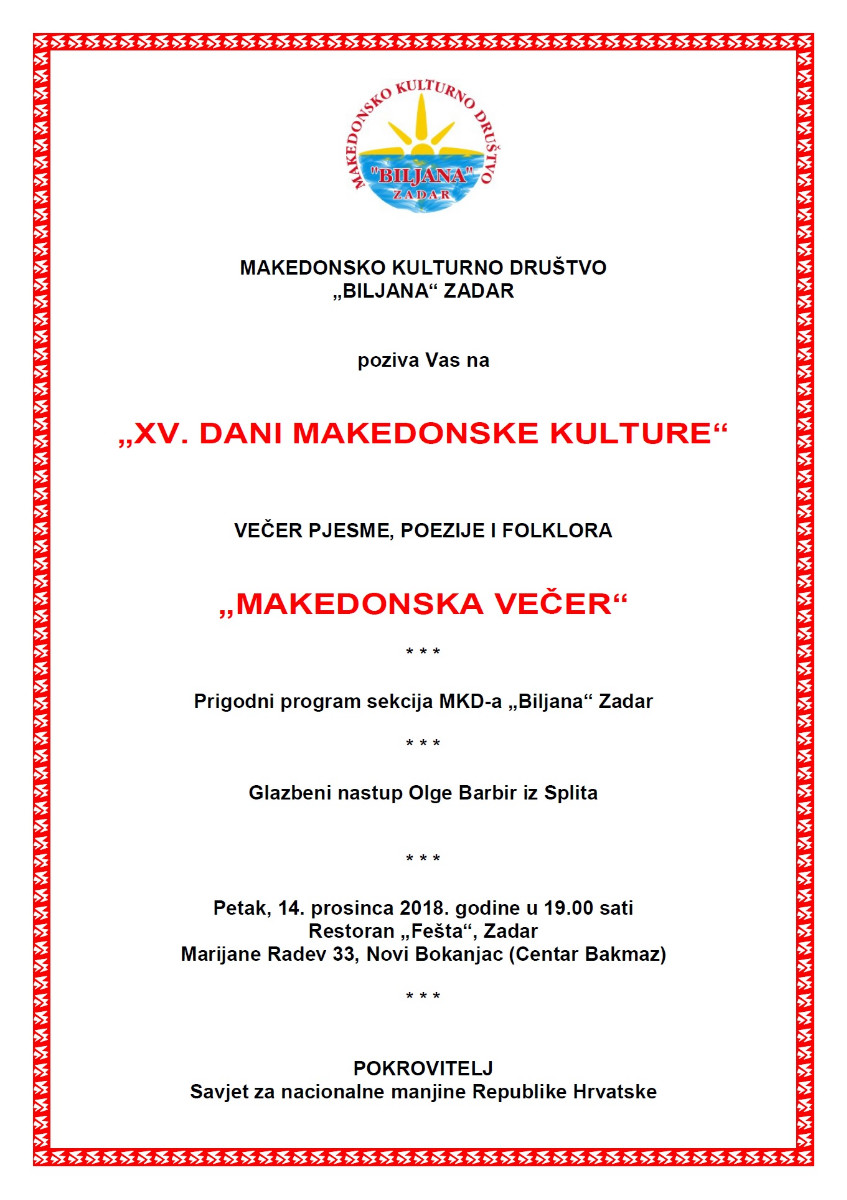 Покана: Денови на македонската култура во Задар epetrovska 3. December 2018. ZADAR – POZIVNICA DANI MK KULTURE 2018 MAKEDONSKA VECER
