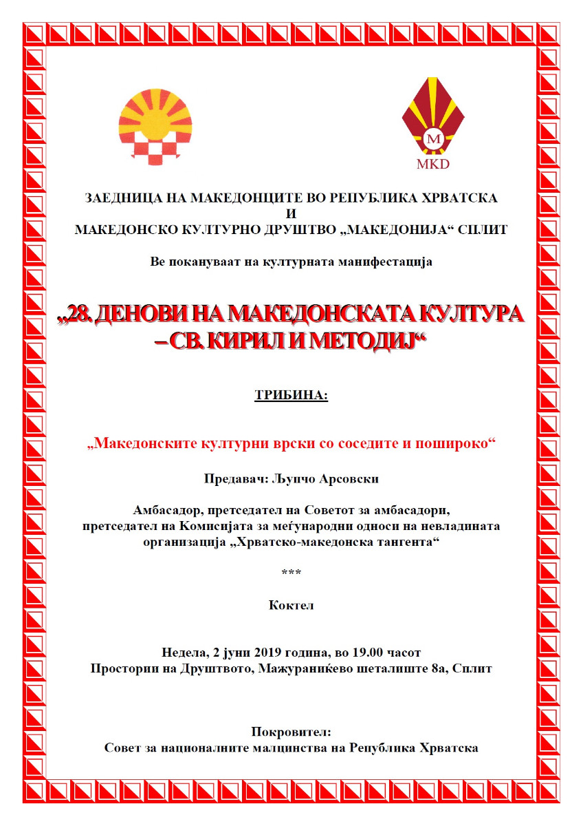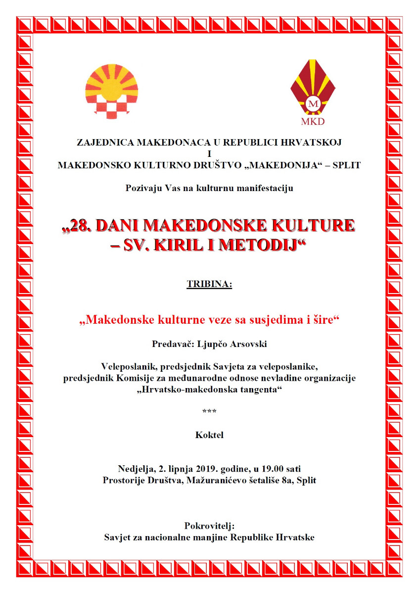 Покана: “28. Денови на македонската култура – Св. Кирил и Методиј” – Сплит epetrovska 15. May 2019. POZIVNICA-28. DANI MK. KULTURE-SPLIT POZIVNICA-28. DANI MK. KULTURE-SPLIT – TRIBINA