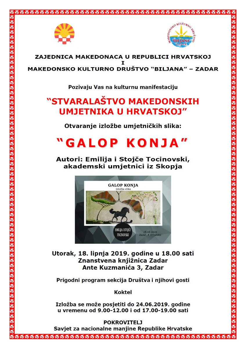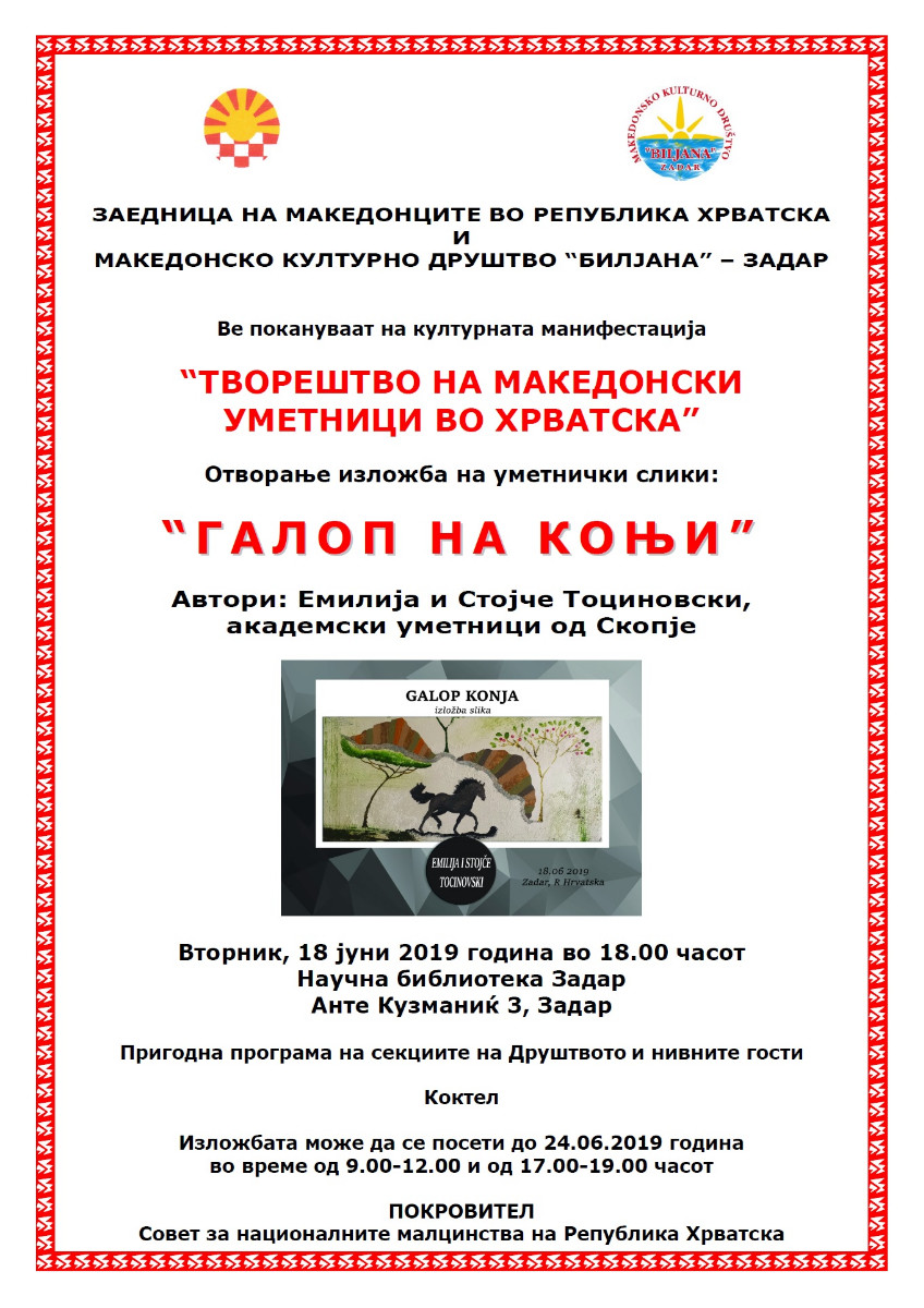 Покана: Изложба “Творештво на македонски уметници во РХ” – Задар epetrovska 10. June 2019. Pozivnica – Stvaralastvo mk. umjetnika u RH