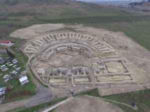 Скупи има многу ископини од кои најзначаен е монументалниот антички театар со капацитет за околу 9 илјади гледачи. Изграден бил во 2. век и е најголем во Македонија. Театарската зграда е долга 98 м и широка 15 м, а низ неа водат 3 ходника до оркестрата која има радиус од 15 м. Зградата и фасадата на сцената биле богато и луксузно украсени со мермер. Служел главно за забава, за драмски и други претстави.