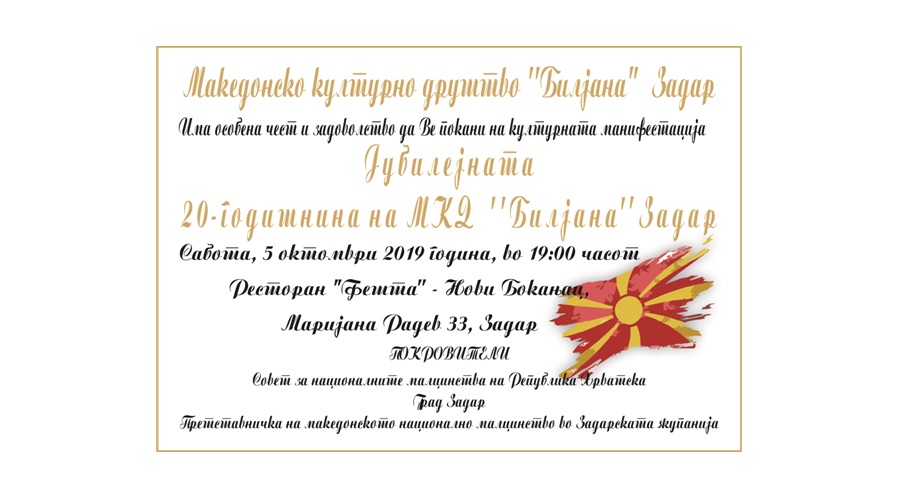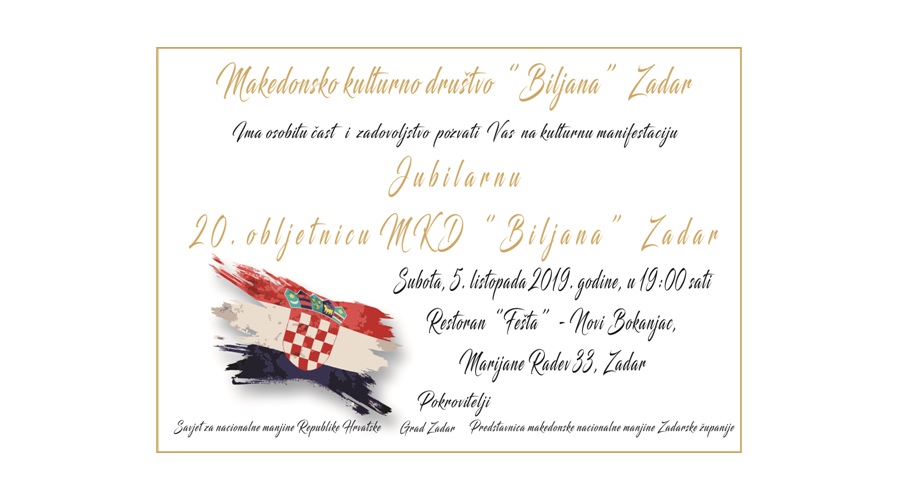 Покана: Јубилејна 20-годишнина на МКД “Билјана” – Задар epetrovska 20. September 2019. 20 G. MKD BILJANA – ZADAR 20 G. MKD BILJANA – ZADAR plakat