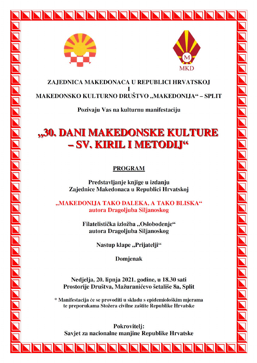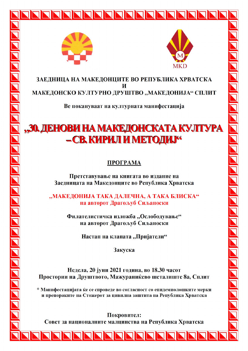 Покана: “30. Денови на македонската култура – Св. Кирил и Методиј” – Сплит epetrovska 17. June 2021. POZIVNICA-30. DANI MK. KULTURE-SPLIT