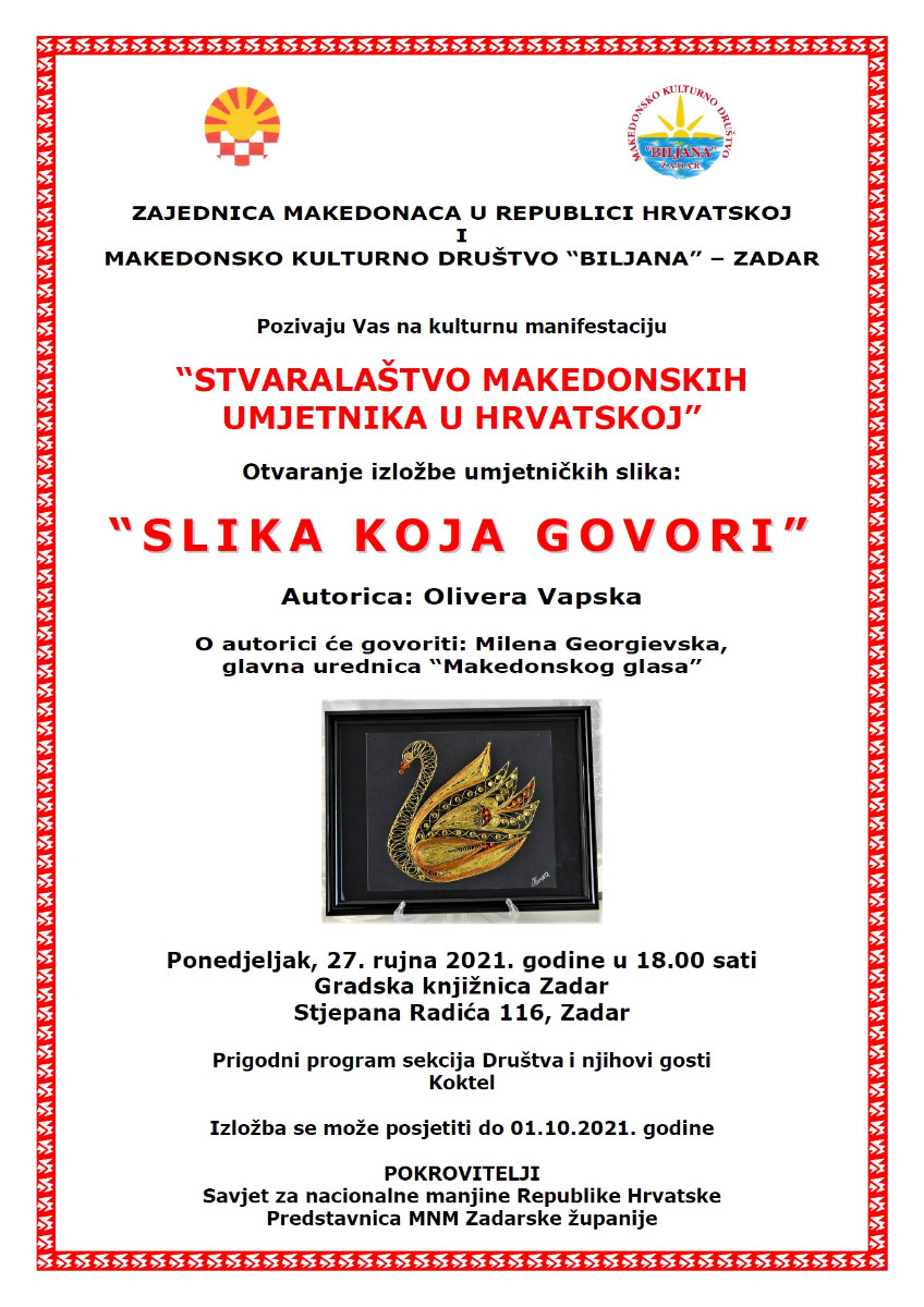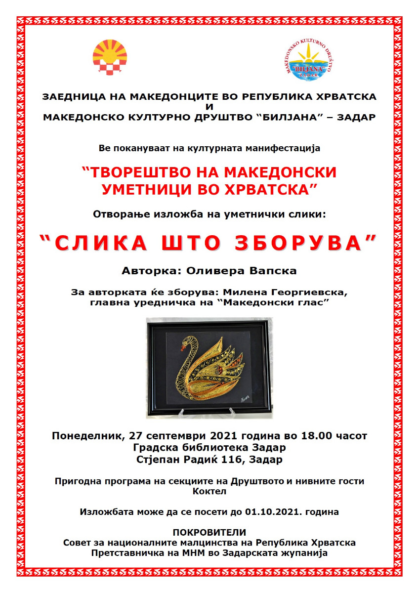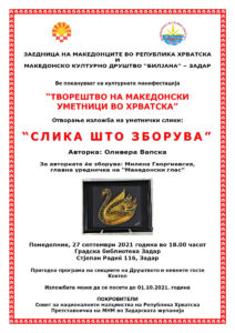 Покана: Изложба “Творештво на македонски уметници во РХ” – Задар epetrovska 21. September 2021. Pozivnica – Stvaralastvo mk. umjetnika u RH