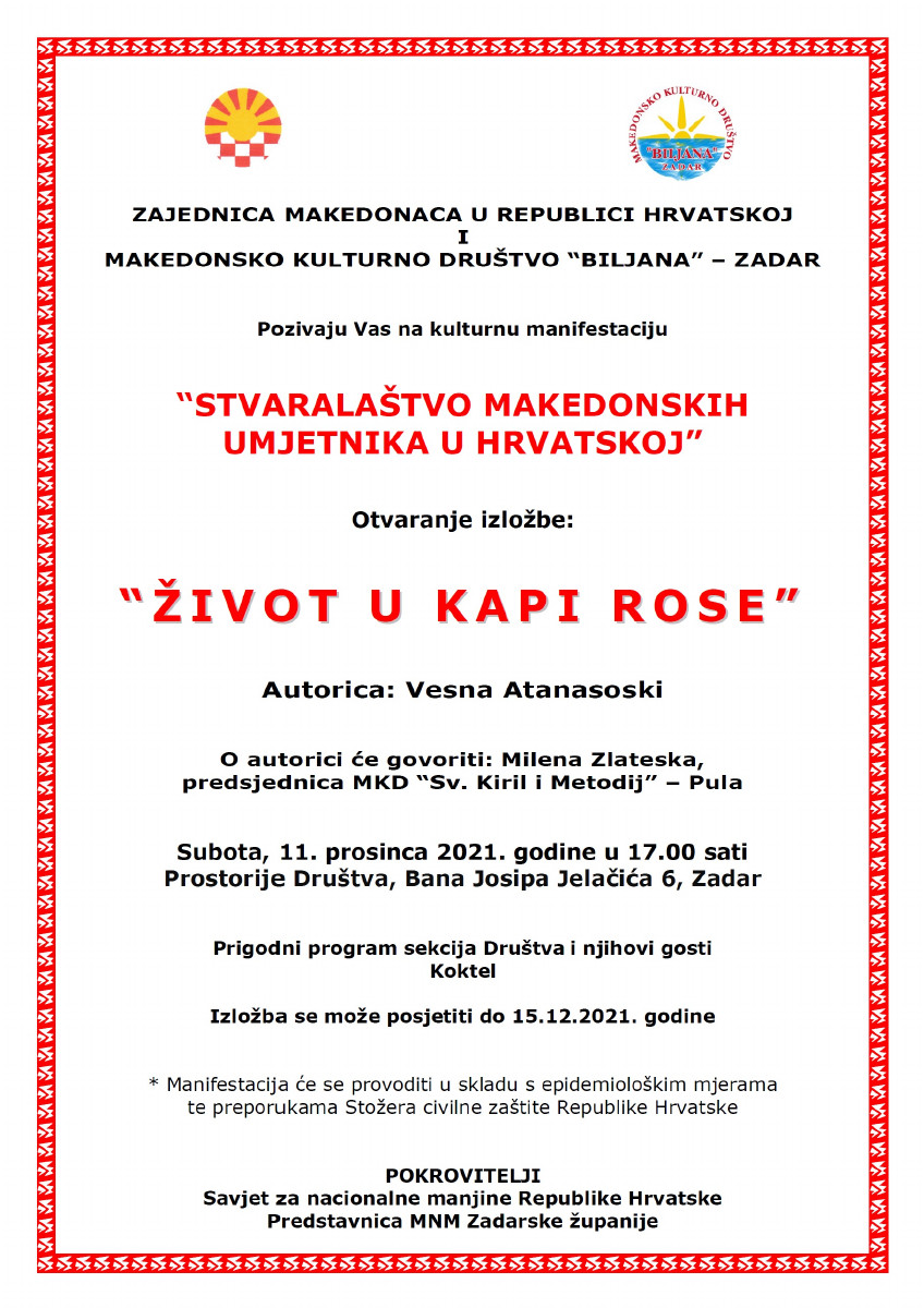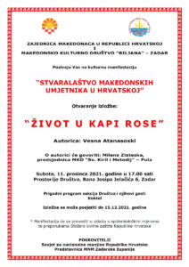 Pozivnica: Izložba “Stvaralaštvo makedonskih umjetnika u RH” – Zadar epetrovska 7. prosinca 2021. Pozivnica 1 – Stvaralastvo mk. umjetnika u RH