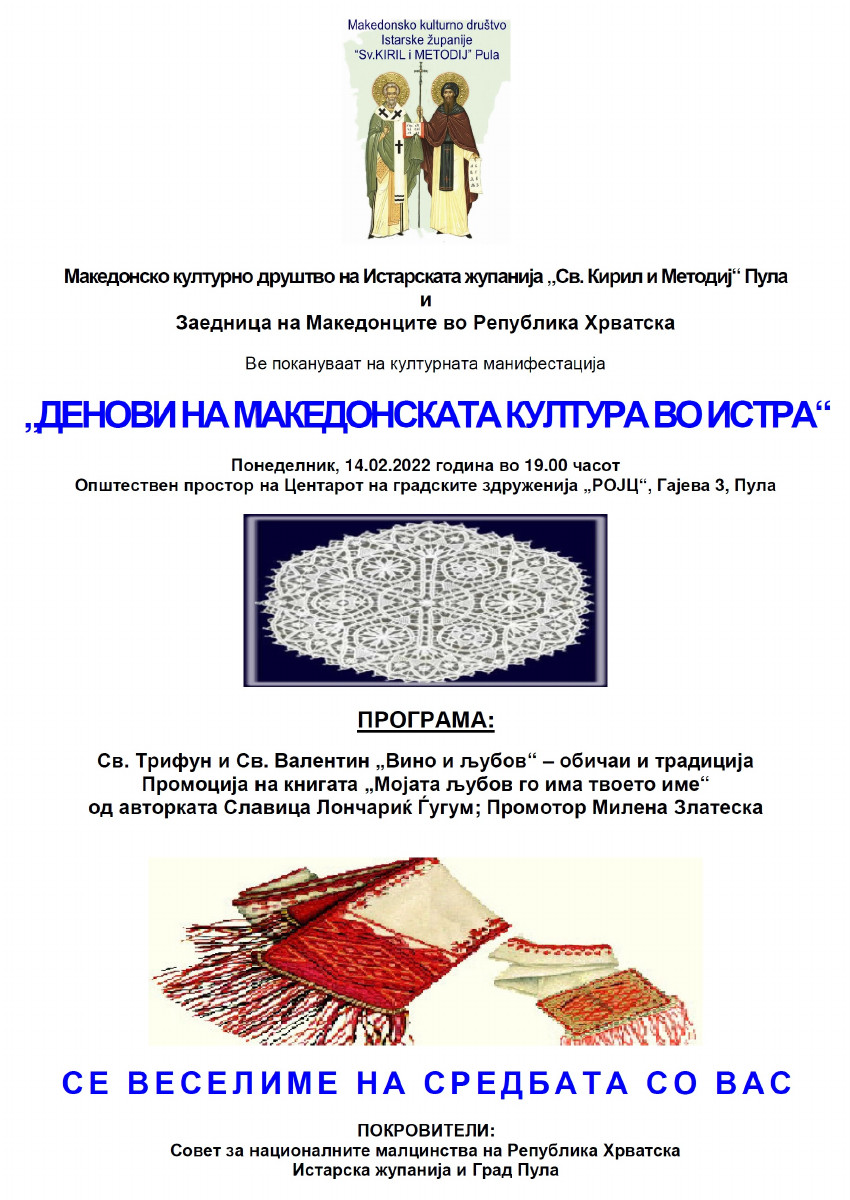 Покана: Прослава на св. Трифун & св. Валентин во Пула epetrovska 11. February 2022. Pozivnica- 2022 g Dani mk kulture – sv. Trifun