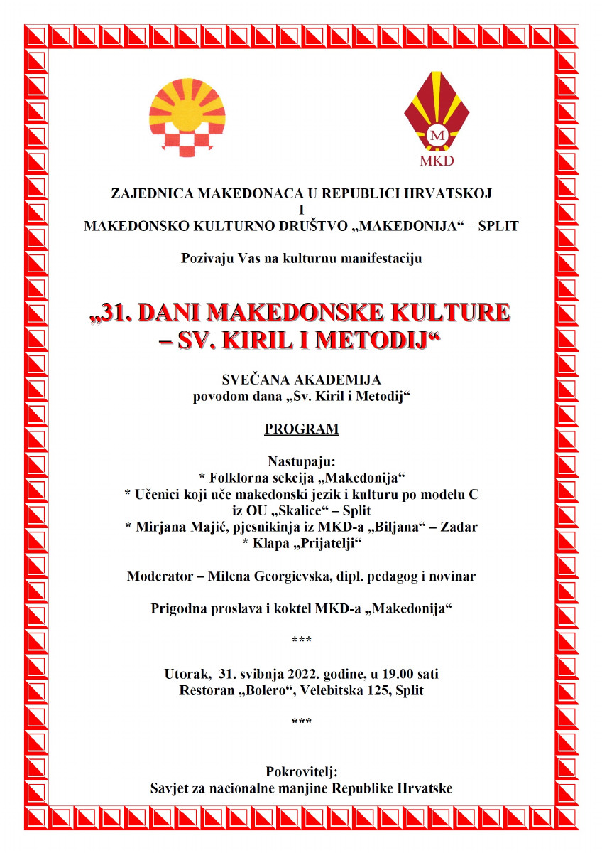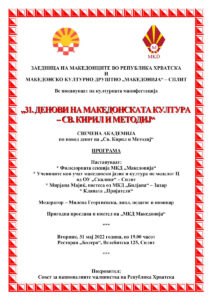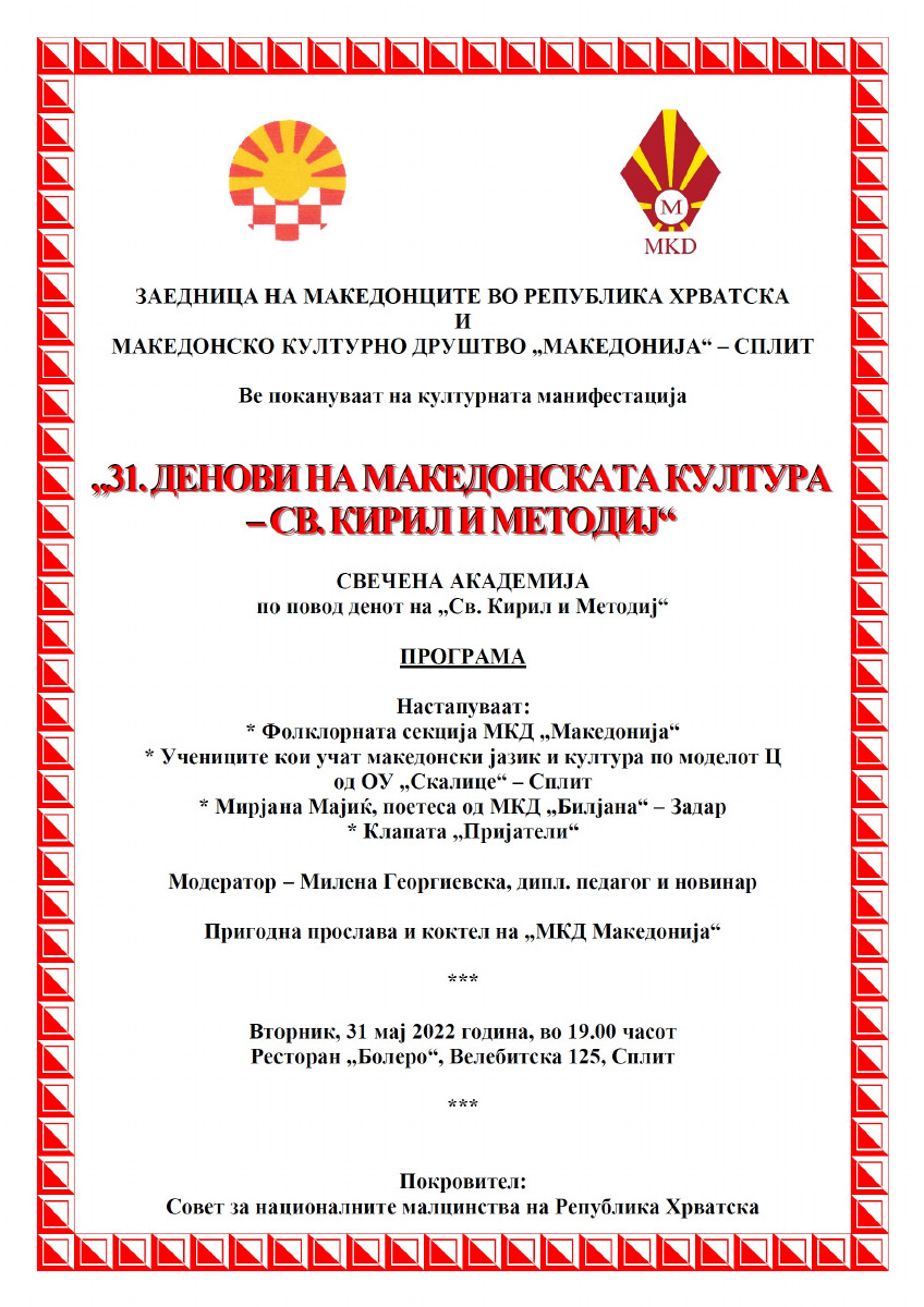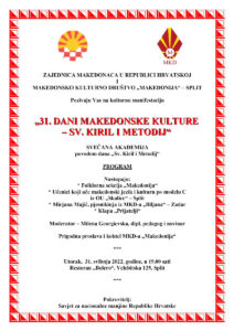 Покана: “31. Денови на македонската култура – Св. Кирил и Методиј” – Сплит epetrovska 23. May 2022. POZIVNICA-31. DANI MK. KULTURE-SPLIT
