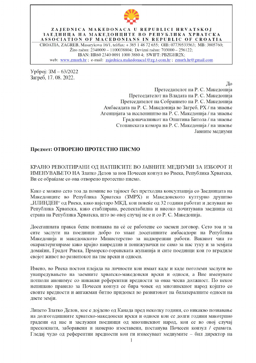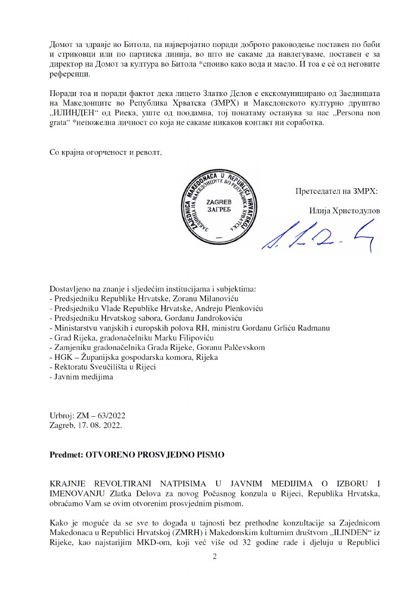 Kako je moguće da se sve to događa u tajnosti bez prethodne konzultacije sa Zajednicom Makedonaca u Republici Hrvatskoj (ZMRH) i Makedonskim kulturnim društvom „ILINDEN“ iz Rijeke, kao najstarijim MKD-om, koji već više od 32 godine rade i djeluju u Republici Hrvatskoj, kao etablirana, respektabilna i visoko cijenjena zajednica od strane Republike Hrvatske, što u ovom slučaju nije i s R. S. Makedonijom.