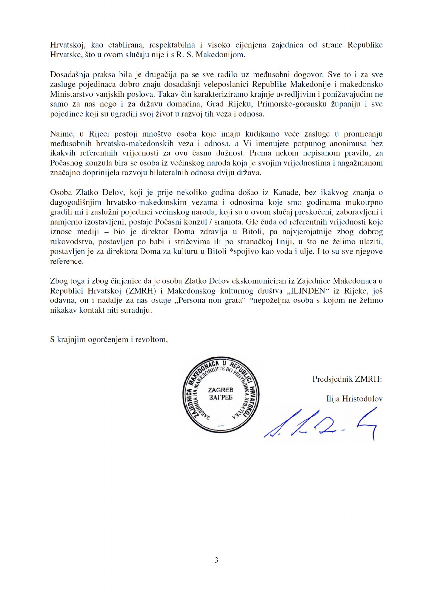 Zbog toga i zbog činjenice da je osoba Zlatko Delov ekskomuniciran iz Zajednice Makedonaca u Republici Hrvatskoj (ZMRH) i Makedonskog kulturnog društva „ILINDEN“ iz Rijeke, još odavna, on i nadalje za nas ostaje „Persona non grata“ *nepoželjna osoba s kojom ne želimo nikakav kontakt niti suradnju.