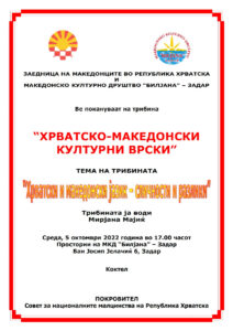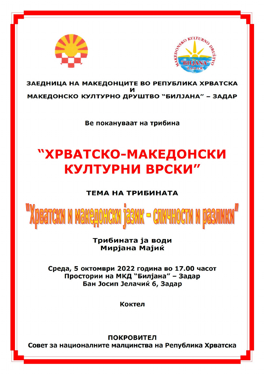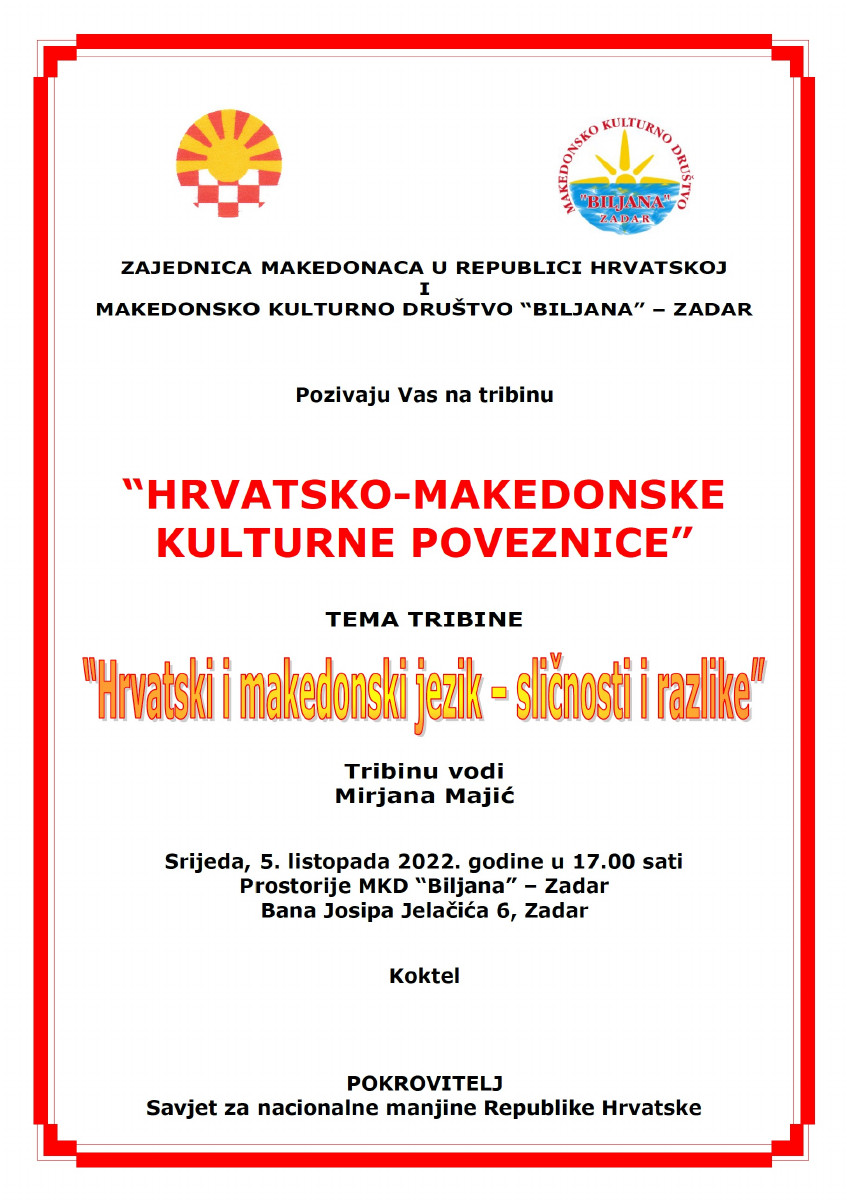 Pozivnica: Tribina “Hrvatsko-makedonske kulturne poveznice” u Zadru epetrovska 4. listopada 2022. POZIVNICA TRIBINA 2022- ZADAR