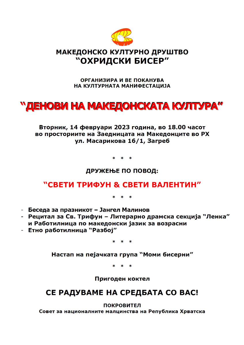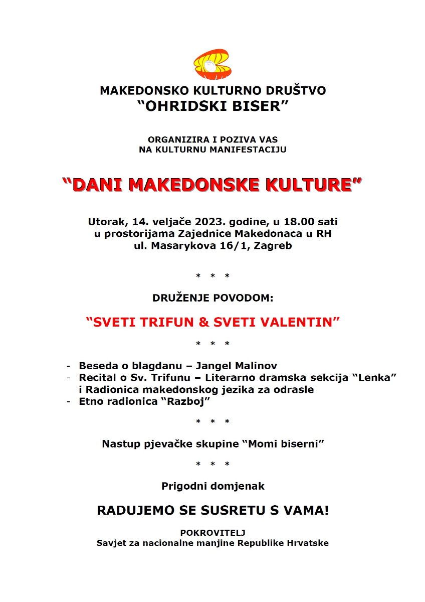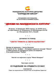 Покана: Прослава на св. Трифун & св. Валентин во Загреб epetrovska 8. February 2023. Dani makedonske kulture 2023 – Sv.Trifun-Sv.Valentin