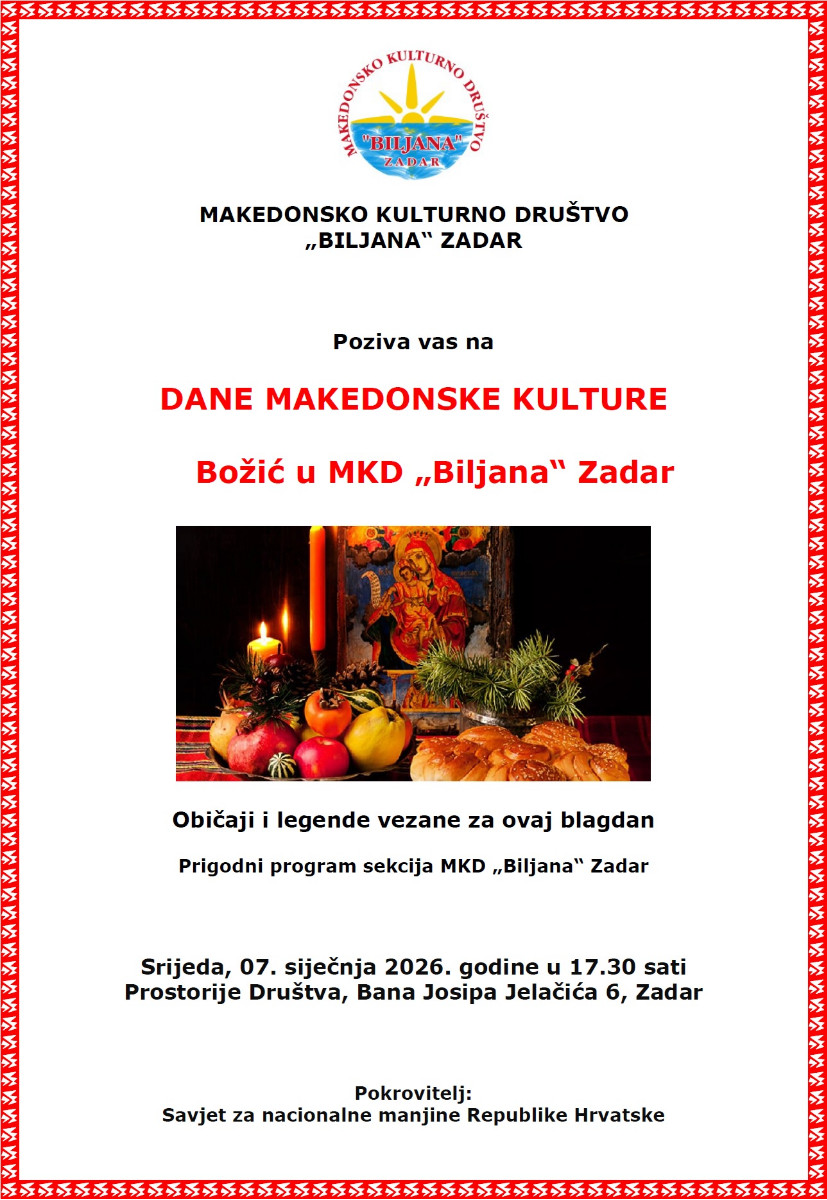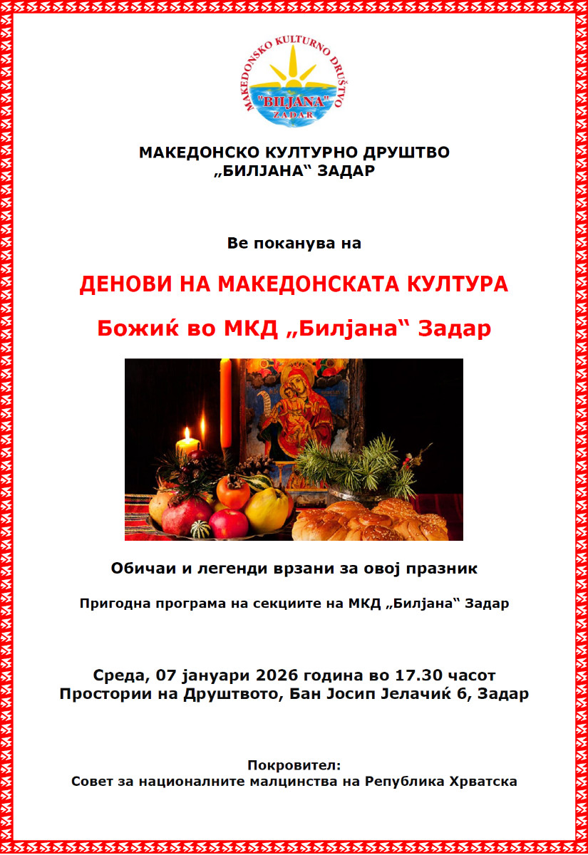 Pozivnica: Božić u MKD „Biljana“ Zadar epetrovska 2. siječnja 2026. ZADAR – POZIVNICA DANI MK KULTURE 2025 BOZIC