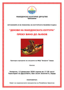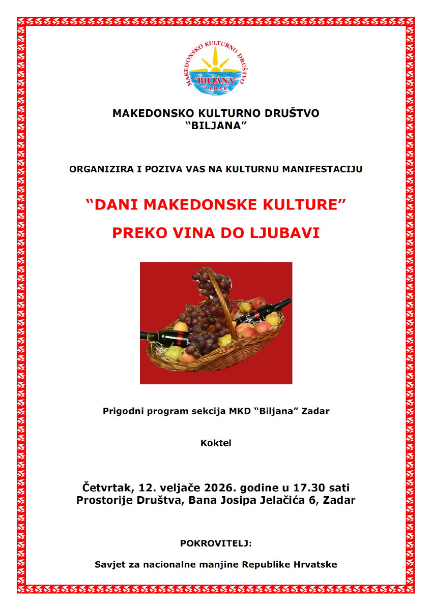 Покана: Прослава на виното и љубовта во Задар epetrovska 4. February 2026. ZADAR – POZIVNICA DANI MK KULTURE 2026 VINO I LJUBAV