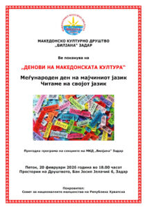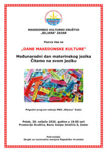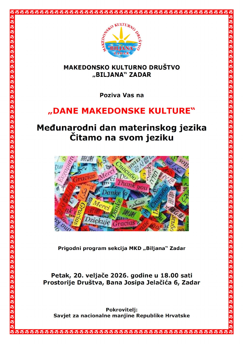 Pozivnica: Proslava Međunarodnog dana materinskog jezika u Zadru epetrovska 16. veljače 2026. ZADAR – POZIVNICA DANI MK KULTURE 2026 MATERINSKI JEZIK