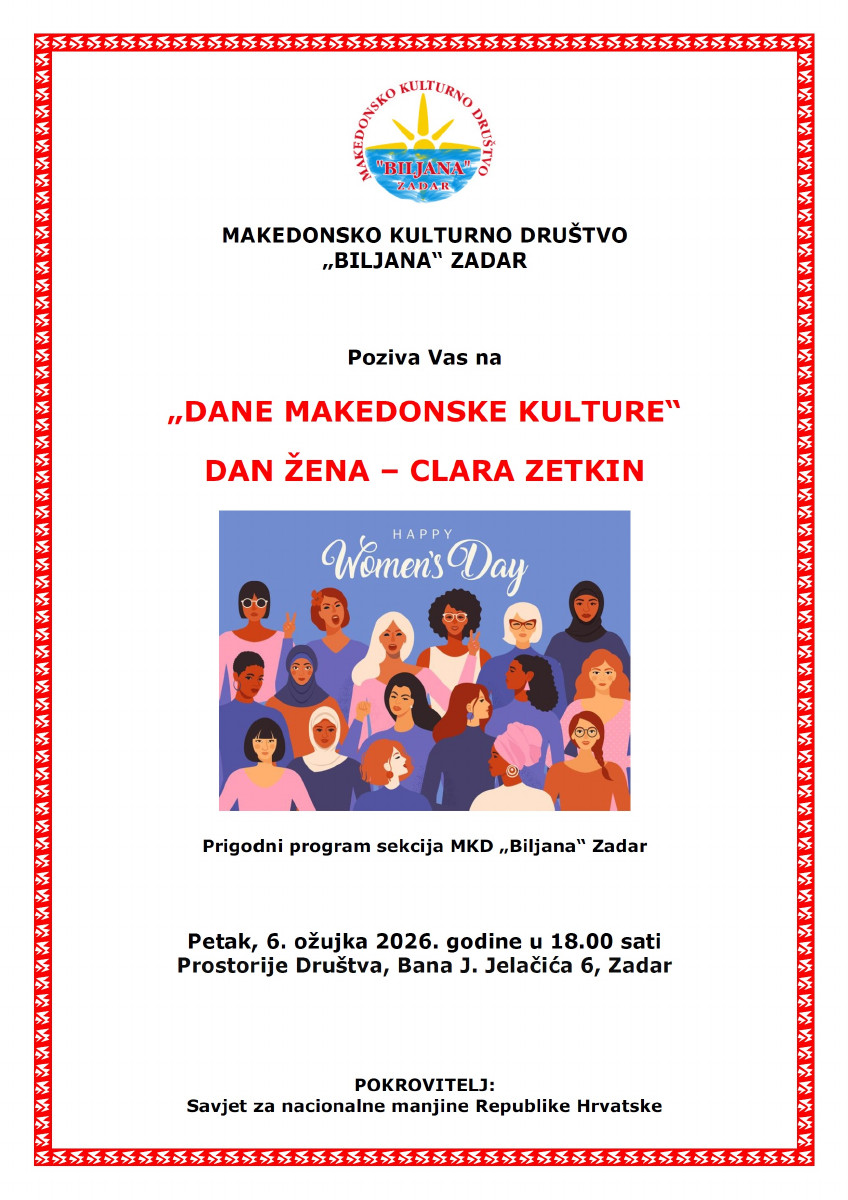 Покана: Прослава по повод Денот на жената во Задар epetrovska 24. February 2026. ZADAR – POZIVNICA DANI MK KULTURE 2026 DAN ZENA