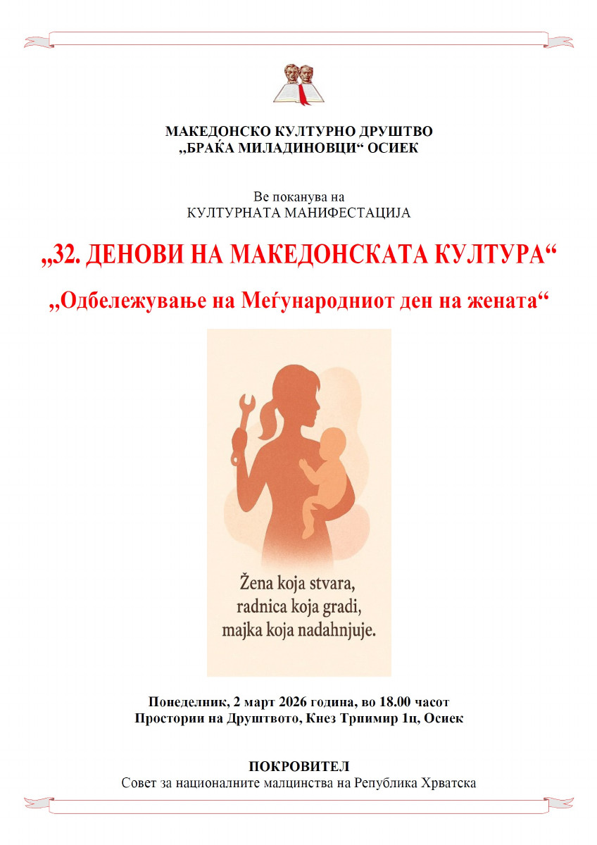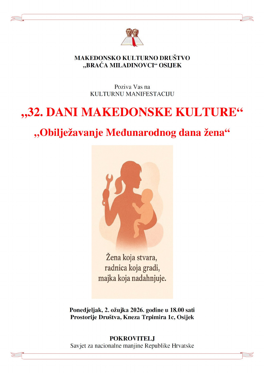 Покана: Одбележување на Денот на жената во Осиек epetrovska 25. February 2026. 32. DANI MK KULTURE MKD OSIJEK 2026 – DAN ZENA