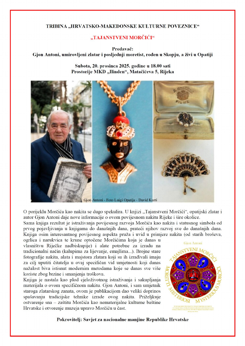 Zajednica Makedonaca u RH u suradnji s MKD „Ilinden“ iz Rijeke, dana 20. prosinca 2025. godine organizirala je tribinu pod nazivom „Hrvatsko-makedonske kulturne poveznice“. Tribina na temu „Tajanstveni morčići“ održana je u prostorijama MKD „Ilinden“ u Rijeci, pod pokroviteljstvom Savjeta za nacionalne manjine RH. Predavač na tribini bio je Gjon Antoni, umirovljeni zlatar i posljednji moretist.